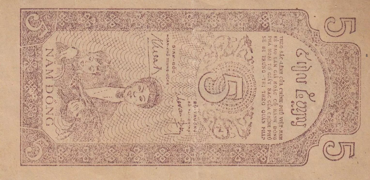 Le verso du billet comporte la valeur nominale "5" ainsi que les mots "NAM DONG". On y trouve également la mention "KIEU THU II".