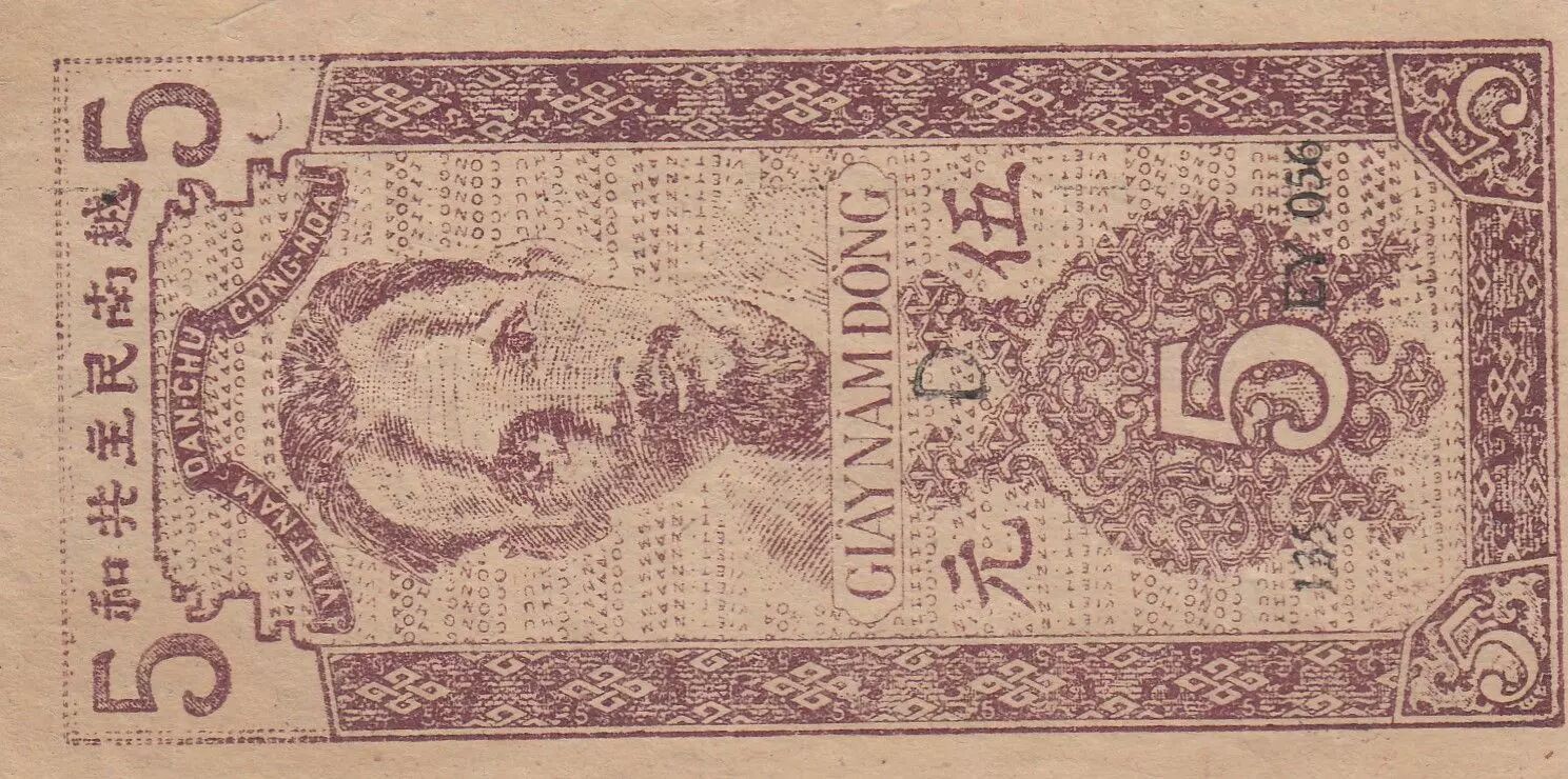 L'avers du billet met en évidence Hô Chi Minh, figure politique vietnamienne et président du Vietnam. On y trouve également les inscriptions suivantes : "VIET-NAM DAN-CHU CONG-HOA" et "GIAYNAM DONG", ainsi que la valeur faciale "5".
