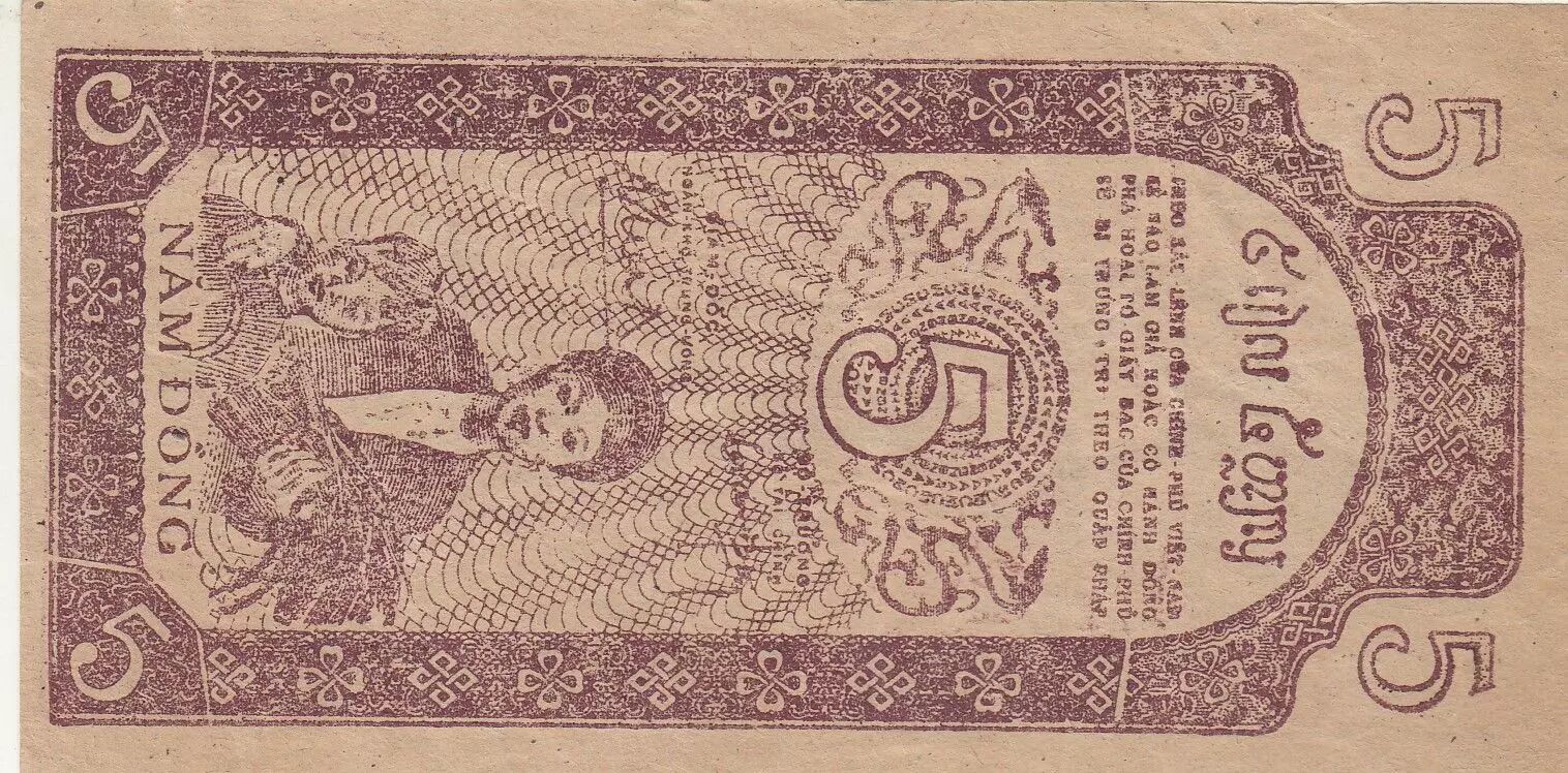 Le revers du billet comporte la valeur nominale "5", suivie de "NAM DONG" et de "KIEU THU II".