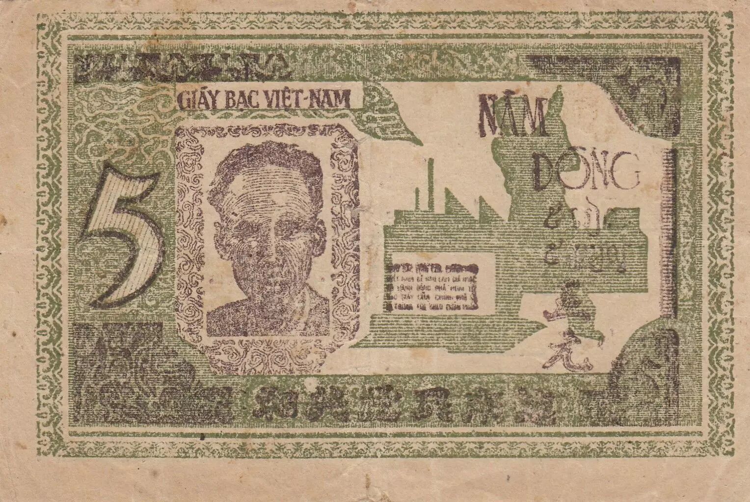 Le revers du billet met en scène H? Chí Minh, figure emblématique du Vietnam, également avec des usines en arrière-plan, soulignant l'importance de l'industrialisation pour le pays. La valeur nominale "5" est répétée, accompagnée de la mention "N?m Ä?ng".