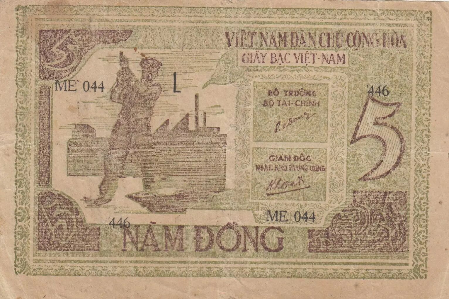 Ce billet de banque, d'une valeur nominale de 5 dongs, a été émis en 1946 par le Vietnam. Il s'agit d'un billet de la série "Ho Chi Minh - Forgeron".