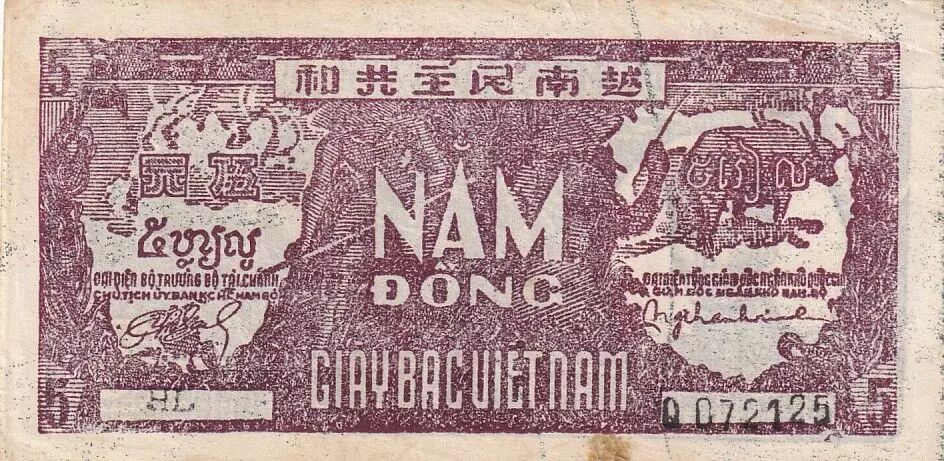 Le billet de 5 Dong de la série HL-Q, émis en 1948, constitue un témoignage historique de la période tumultueuse du Vietnam sous colonisation française. Ce billet a été produit dans des conditions rudimentaires par le gouvernement vietnamien en exil, dirigé par Hô Chi Minh, en réponse au besoin d'une monnaie locale et d'une affirmation de l'identité nationale.