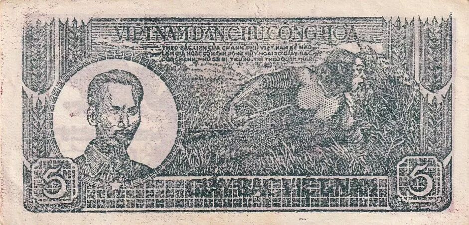Le billet de 5 Dong de la série HL-Q, émis en 1948, constitue un témoignage historique de la période tumultueuse du Vietnam sous colonisation française. Ce billet a été produit dans des conditions rudimentaires par le gouvernement vietnamien en exil, dirigé par Hô Chi Minh, en réponse au besoin d'une monnaie locale et d'une affirmation de l'identité nationale.