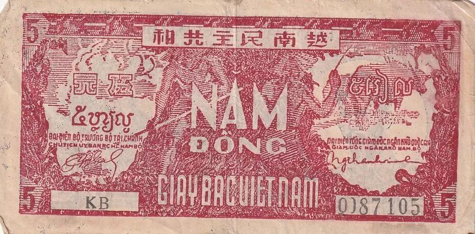 Ce billet de banque d'une valeur de 5 dongs a été émis en 1948 au Vietnam. Il s'agit d'un billet de la série KB-Q. Le contexte de son émission est particulier, puisqu'il s'inscrit dans la période de colonisation française du Vietnam. Face à cette situation, le gouvernement vietnamien en exil, sous la direction de Hô Chi Minh, a mis en place la création de billets de banque de fabrication artisanale.