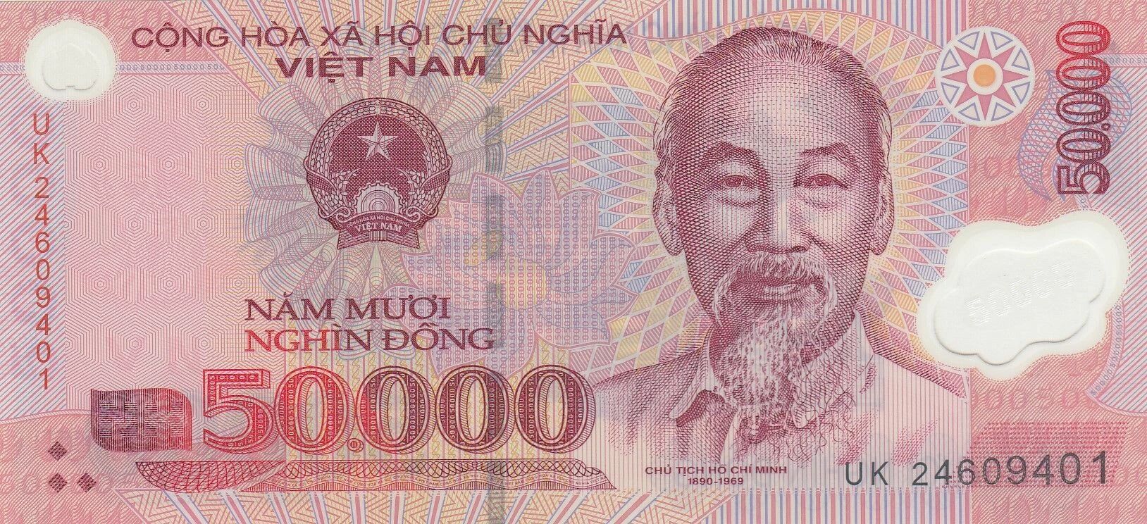 Ce billet de banque est émis par le Vietnam et possède une valeur nominale de 50000 dongs. Il date de l'année 2024 et appartient à une série identifiée par le préfixe "UK".