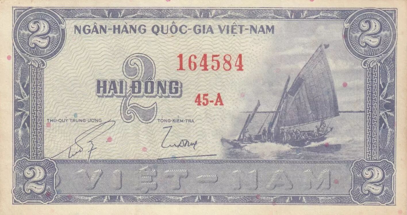 Le billet de 2 Dong, émis en 1955 par le Vietnam du Sud, appartient à la Série 45-A. Ce billet présente des dimensions de 120 mm de longueur et 65 mm de largeur.