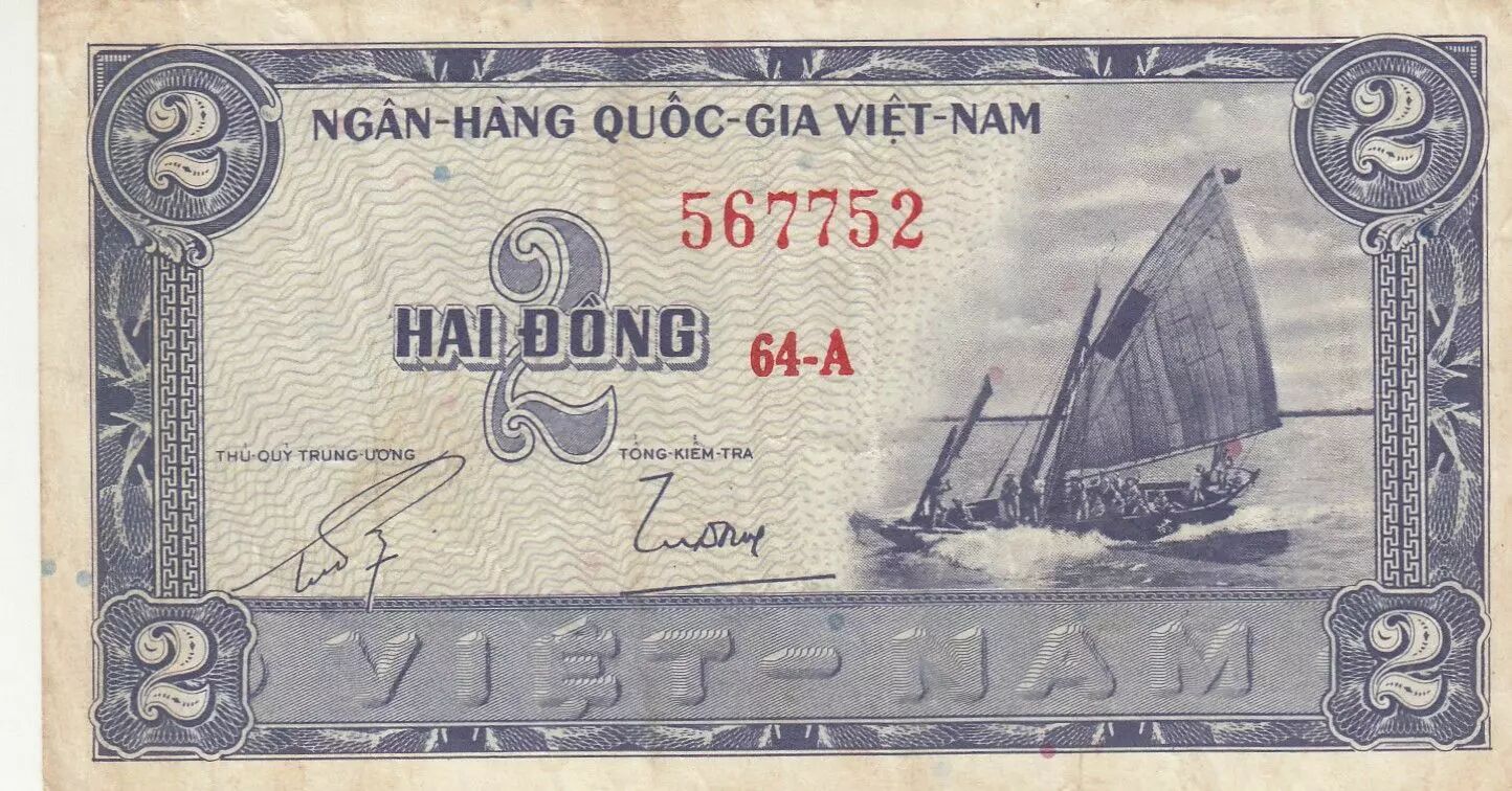 Ce billet de banque, d'une valeur nominale de 2 dongs, a été émis en 1955 par le Vietnam du Sud. Il appartient à la série 64-A.