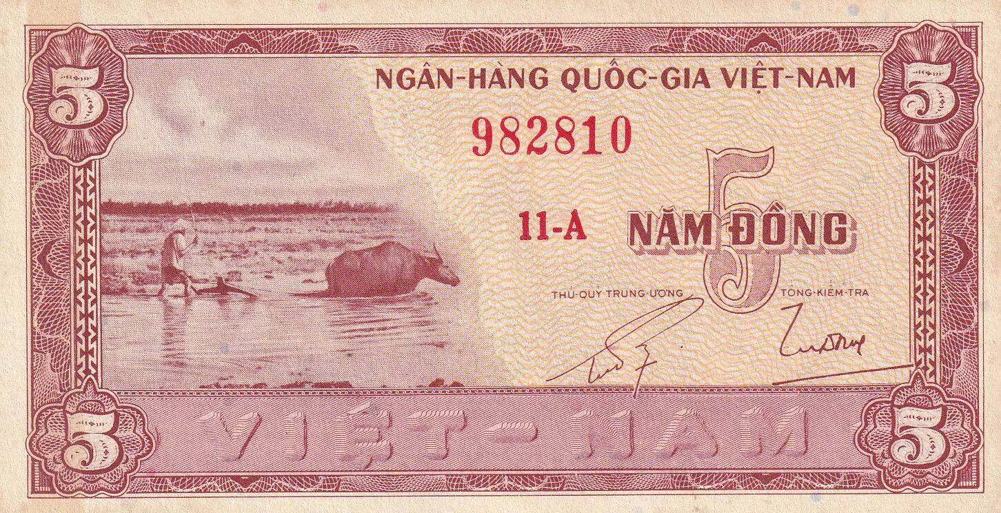 Billet Vietnam du Sud 5 Dong - Buffle - Maison - ND (1955) - Série 11-A - P.13a