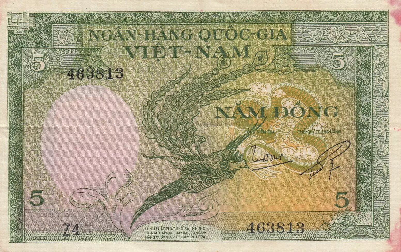 Le billet de 5 Dong, émis par le Vietnam du Sud en 1955, est un spécimen de la série Z4. Ce billet se distingue par ses impressions en vert émeraude et orange, ainsi que par son numéro de série en noir, un élément distinctif de son graphisme.