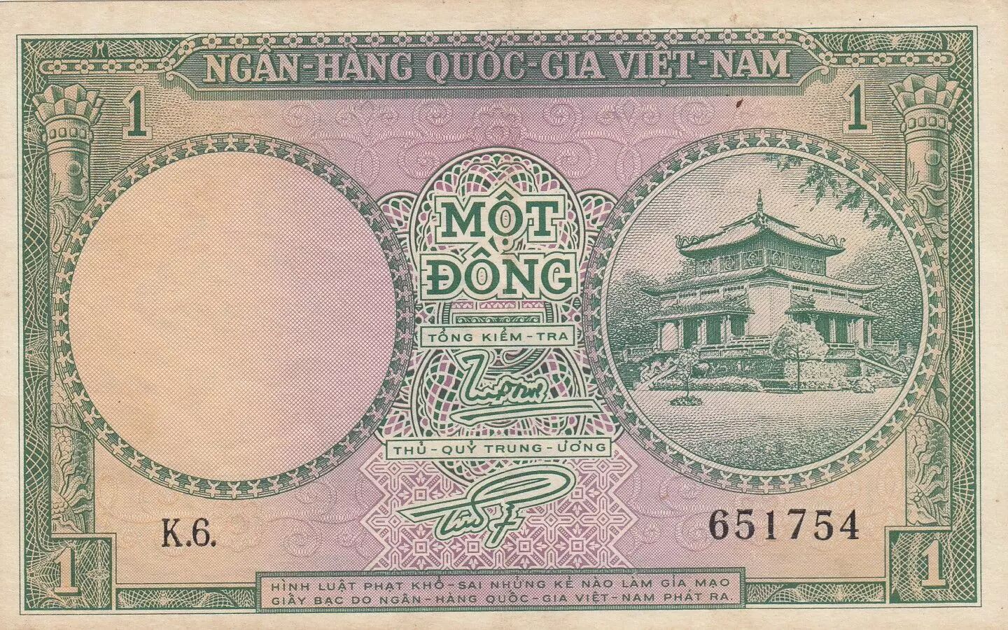 The 1 Dong banknote, issued in 1956 by South Vietnam, features a print in emerald green and dark pink, enhanced by a black serial number. On the obverse, the Temple of King Hùng is depicted on the right, while a watermark is visible on the left. A signature is affixed to the center of the banknote. Ornamental guilloche patterns and rosettes indicating the denomination complete the design. The serial number is positioned at the bottom, divided into two distinct parts.