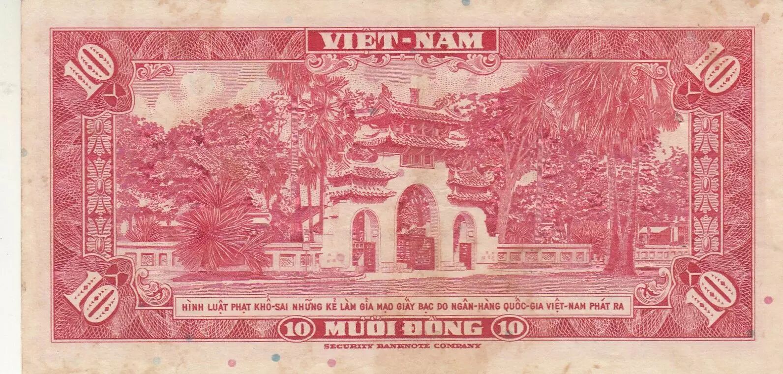 This banknote commemorates important figures and places. The farmers and the sheaf of rice symbolize the importance of agriculture in the economy and life of South Vietnam. The tomb of Lê V?n Duy?t, a mandarin of the royal court of Gia Long, testifies to the historical and cultural heritage of the country.