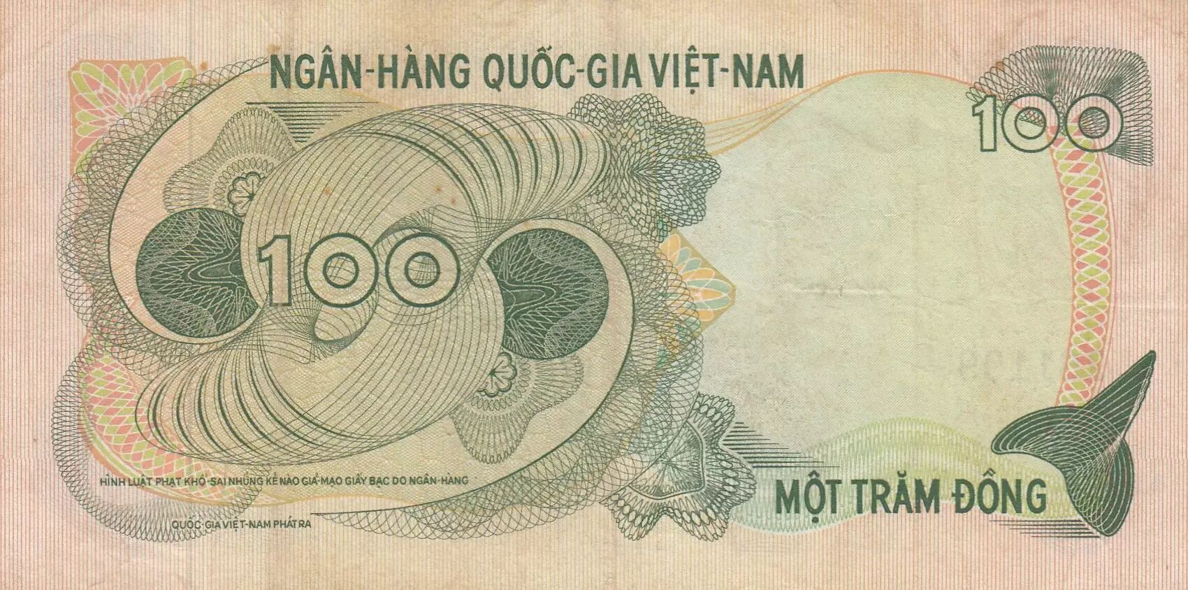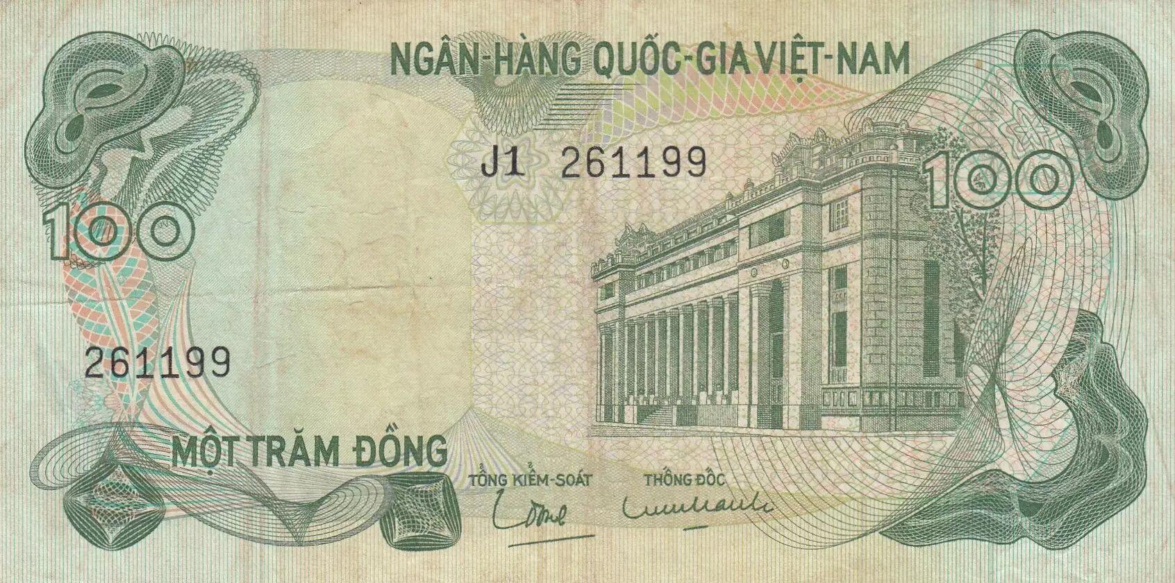 This banknote was issued by South Vietnam in 1970. It represents a face value of 100 dongs. It belongs to Series J.1.