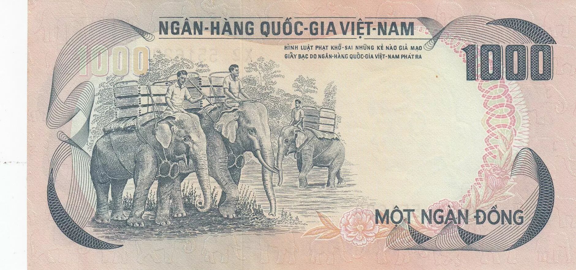 Banknote Vietnam South 1000 Dong, Palace of independence - Elephants - 1972 - P.34