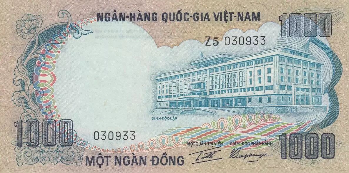 Banknote Vietnam South 1000 Dong, Palace of independence - Elephants - 1972 - P.34