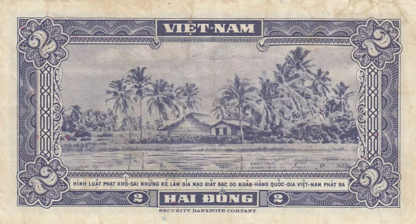 This banknote, with a nominal value of 2 dongs, was issued in 1955 by South Vietnam. It belongs to the 64-A series.