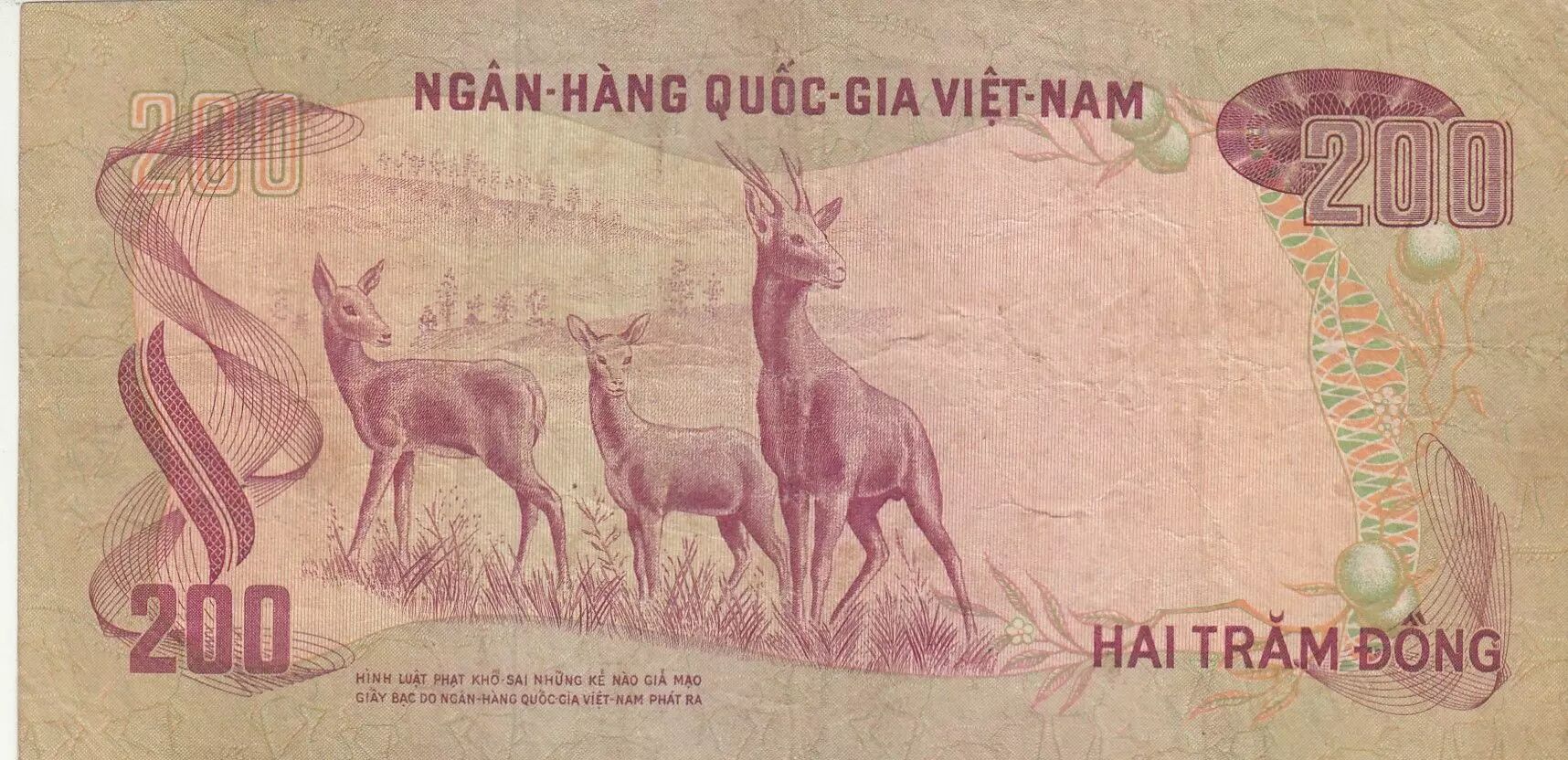 The face value of the banknote is 200 dongs. The face value indicates the purchasing power of the banknote at the time of its issue. As such, it was used for daily economic transactions within South Vietnam.