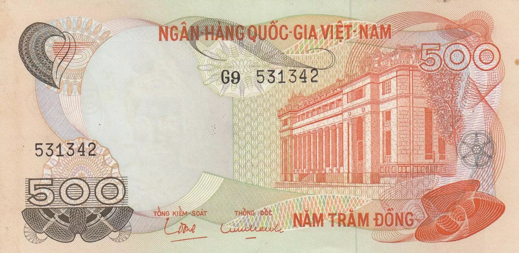 This 500 dong banknote from the G.9 series is a testament to the monetary history of South Vietnam in the 1970s. It combines architectural elements, complex security patterns, and an emblematic historical figure, offering insight into the values and concerns of the time.