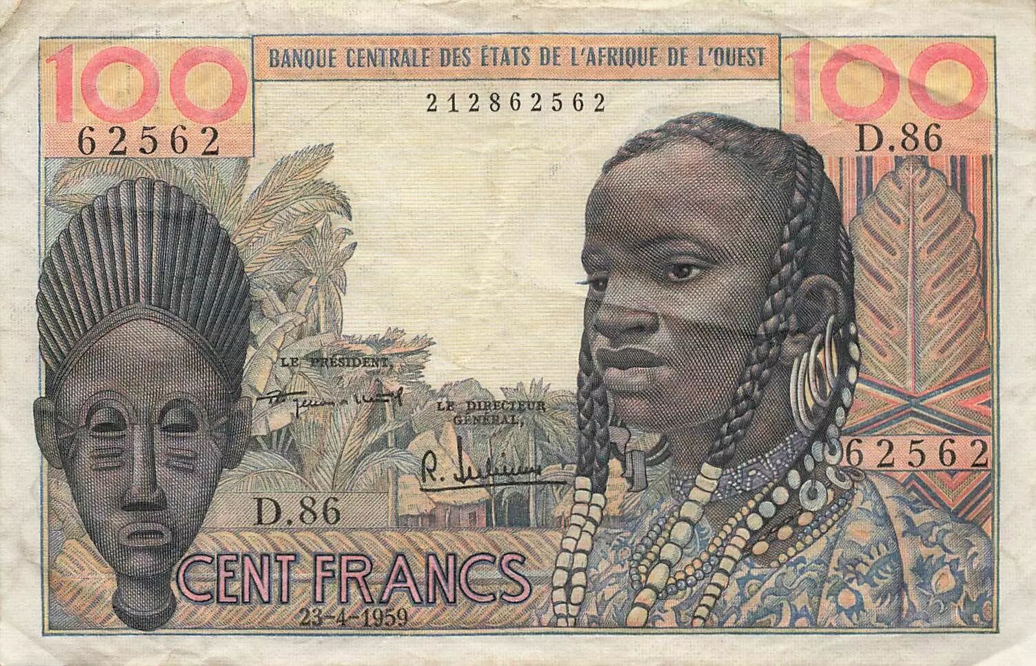 Home > World Banknotes > African Banknotes > West African States > West AFrican States 100 Francs - Mask - 23-04-1959 - P.1