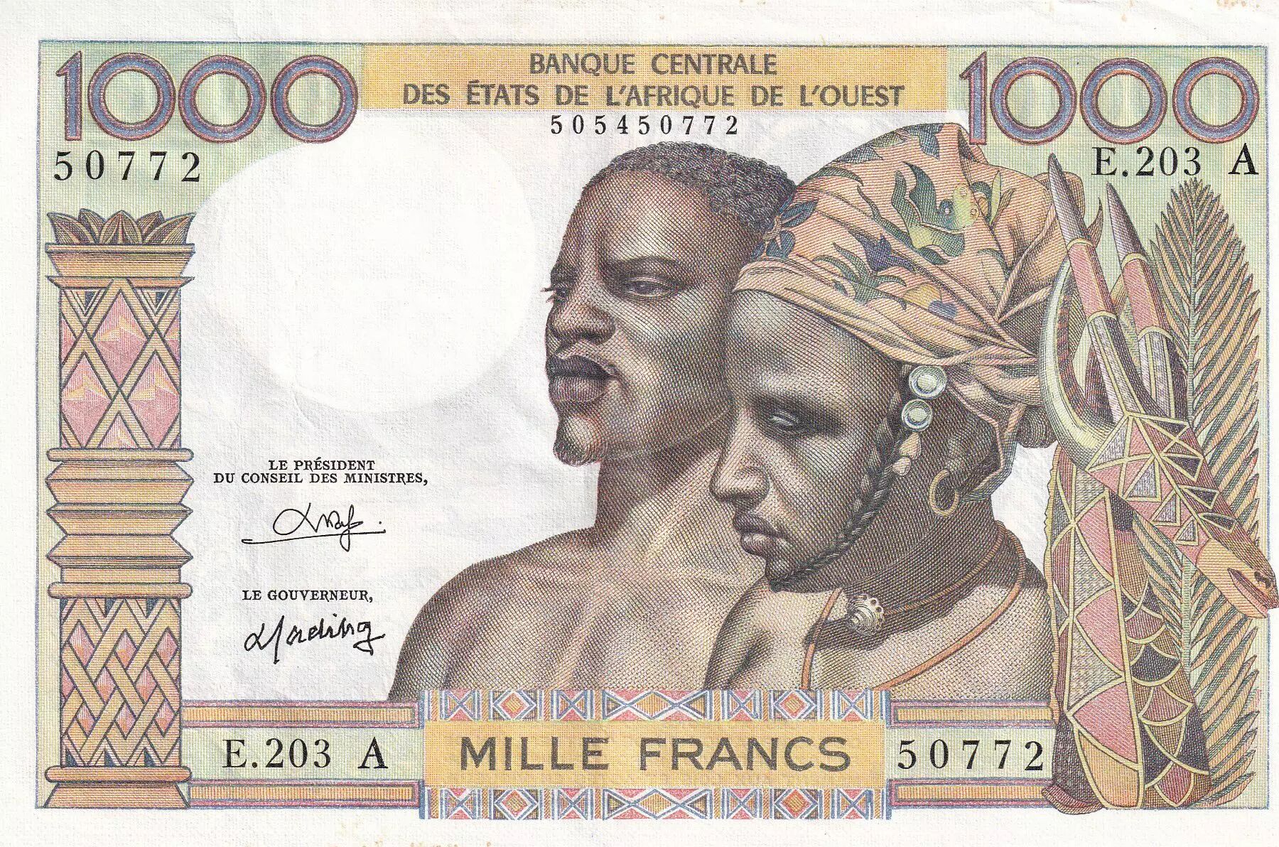 Home > World Banknotes > African Banknotes > West African States > West AFrican States 1000 Francs - Man, woman - ND (1959-1965) - Letter A (Ivory Coast) - Serial E.203 - P.103An