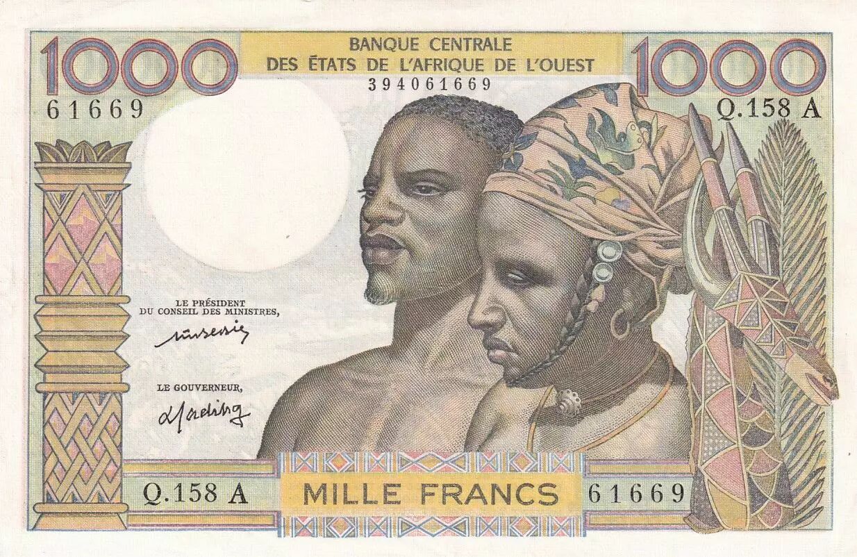 Home > > West AFrican States 1000 Francs - Man, woman - ND (1977) - Letter A (Ivory Coast) - Serial Q.158 A