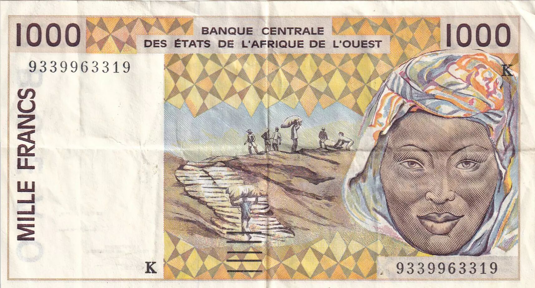 Home > > West AFrican States 1000 Francs - Workmen hauling peanuts - Mask- 1993 - Letter K (Senegal) - P.711K.c