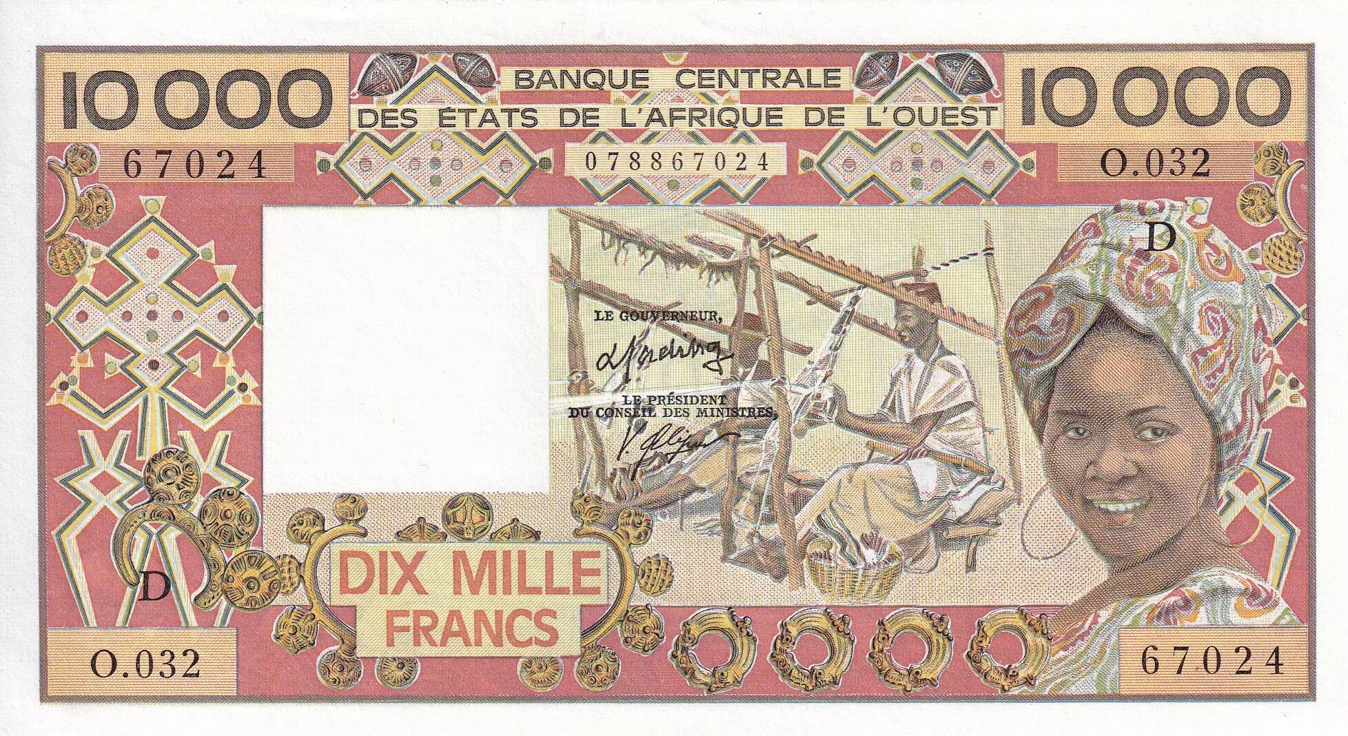 Home > World Banknotes > African Banknotes > West African States > West AFrican States 10000 Francs - Spinning - ND (1986-1987) - Serial O.032 - Lettrer D (Mali) - P.408De