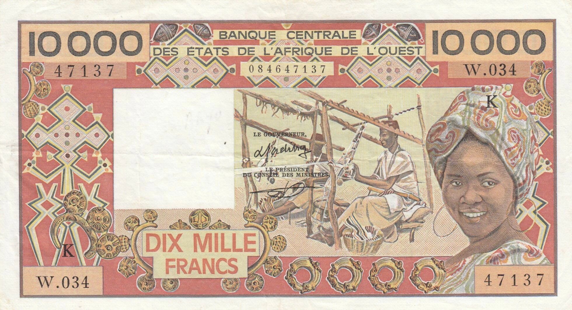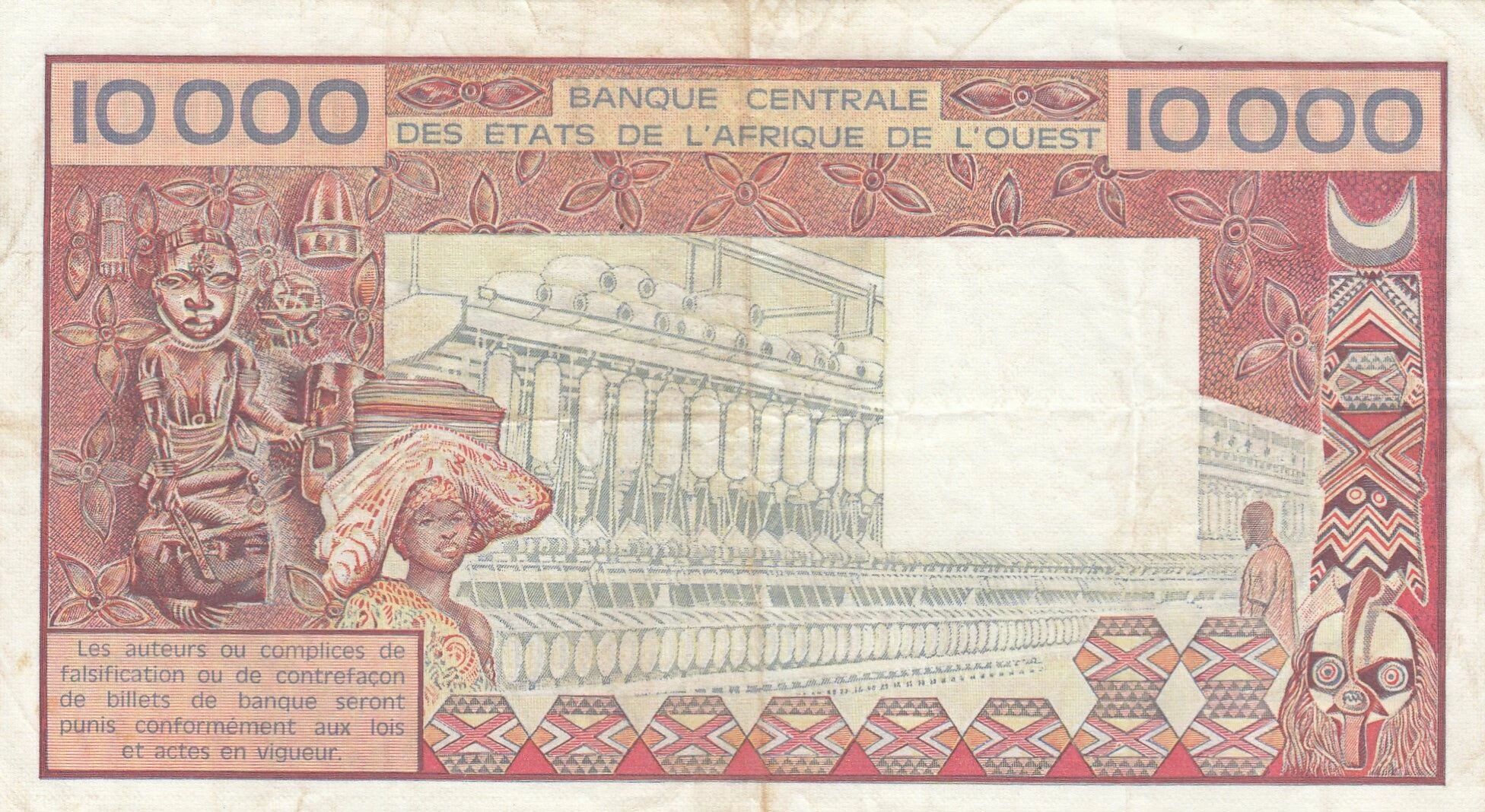 This banknote is issued by the Central Bank of West African States (BCEAO). It represents a face value of 10,000 francs. The main theme of the banknote is weaving.