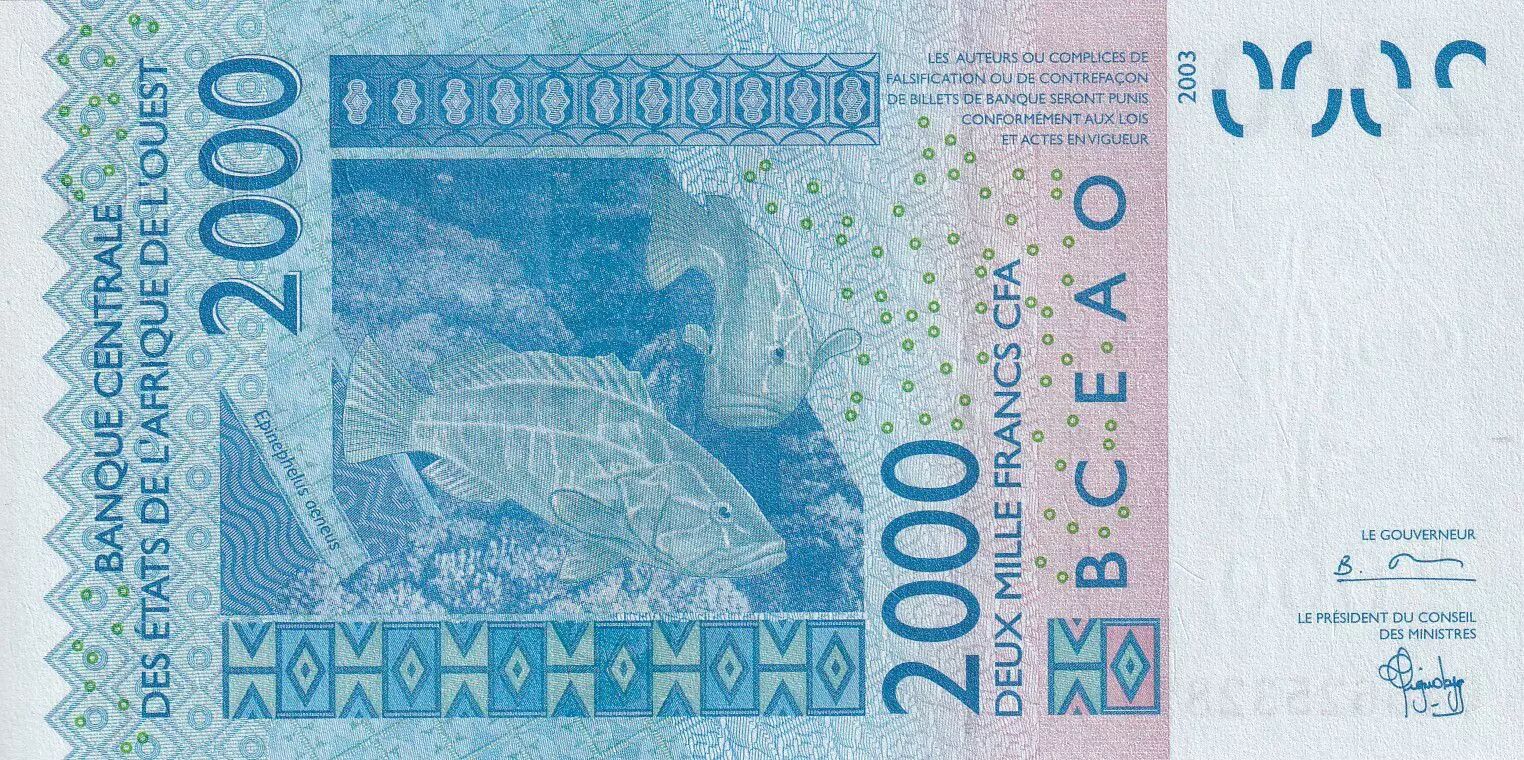 Home > World Banknotes > African Banknotes > West African States > West AFrican States 2000 Francs - Mask - Fishs - 2004 - Letter K ( Senegal) - P.716Kb