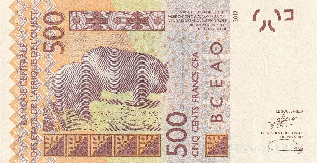 Home > World Banknotes > African Banknotes > West African States > West AFrican States 500 Francs - Mask - Hippopotamus - 2023 - Letter D Mali