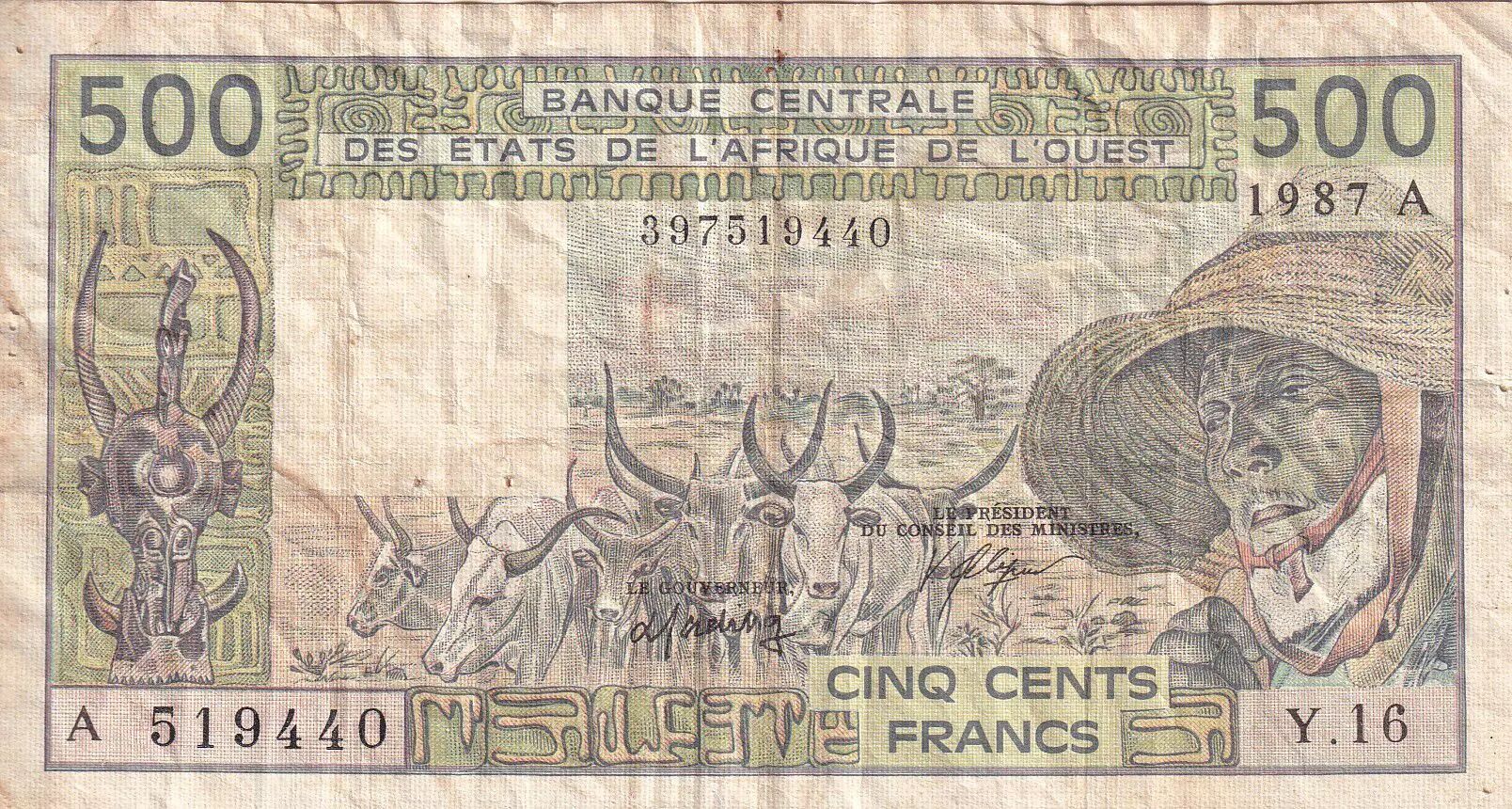Home > > West AFrican States 500 Francs - Old man with zebus - 1987 - Letter A (Ivory Coast) - Serial Y.16 - P.106Ak