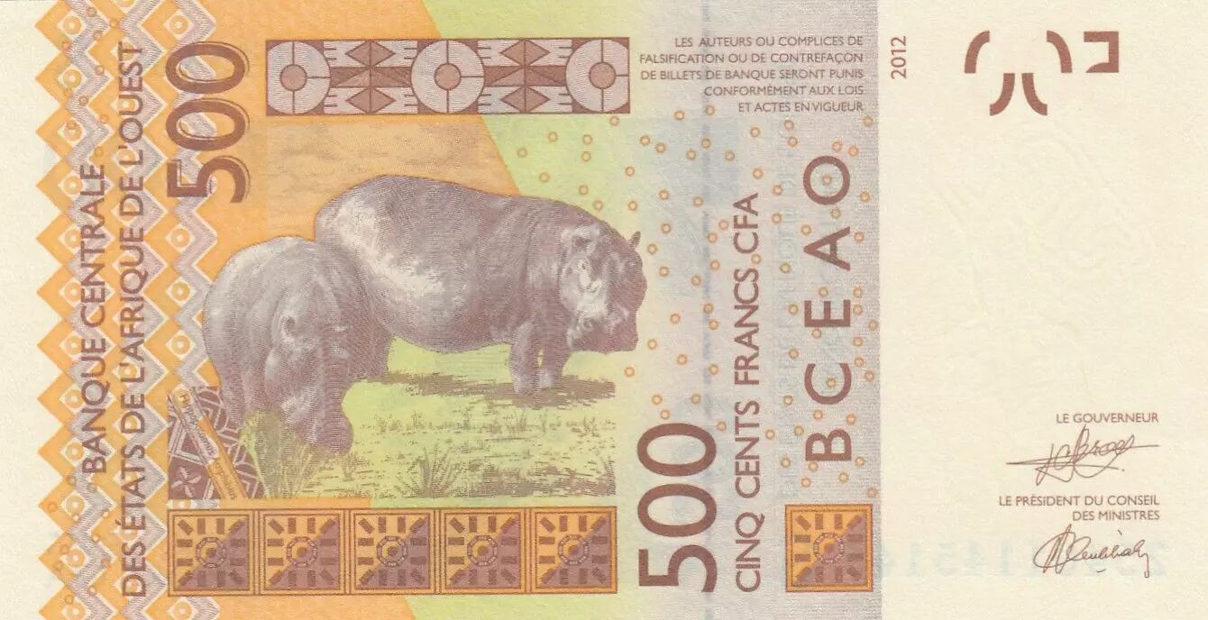 Home > World Banknotes > African Banknotes > West African States > West AFrican States 500 Francs - Stamp - Hippopotamuses - 2025 - Series S