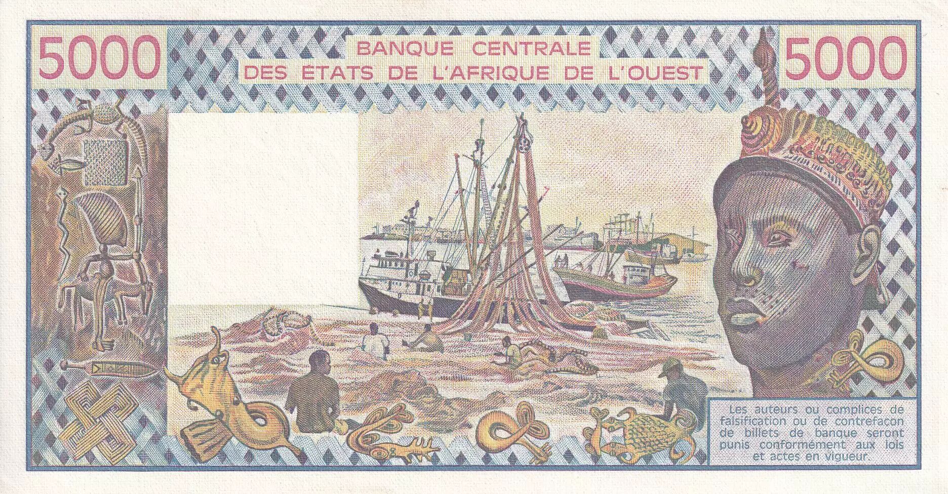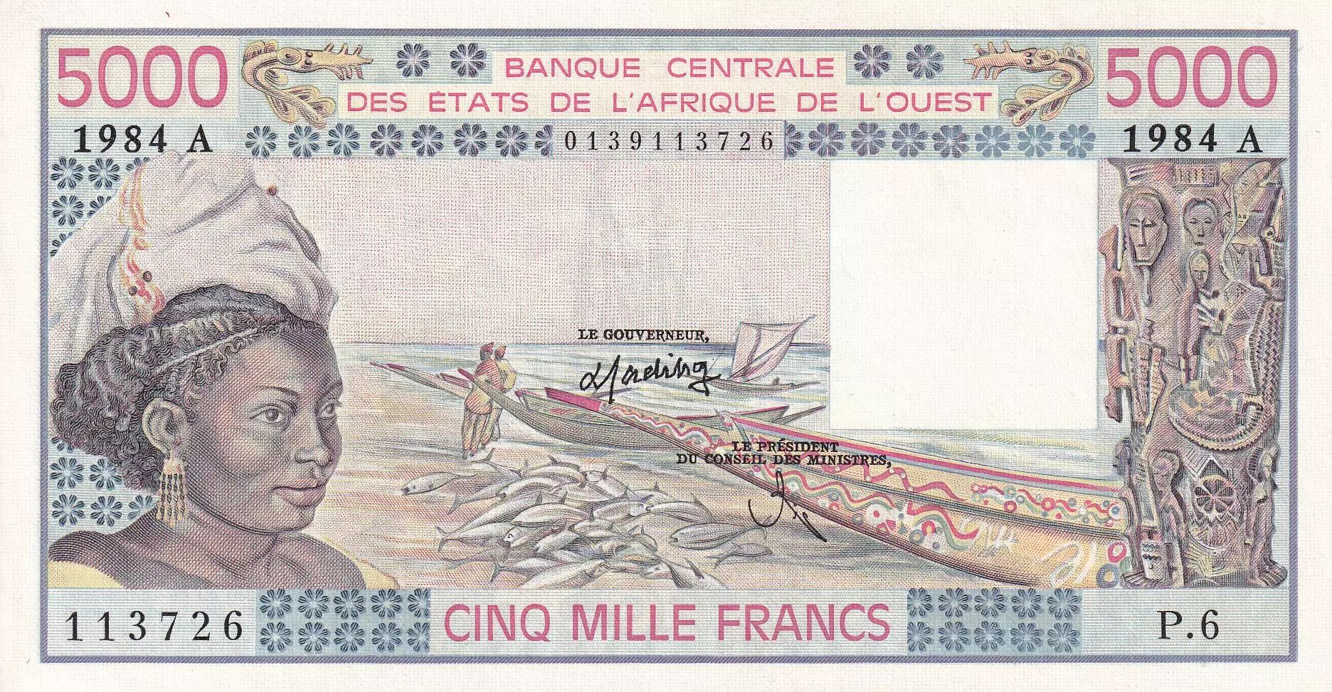 Home > > West AFrican States 5000 Francs 1984 - Woman, fish, boat - Serial P.6 - P.UNC - P.108Ap