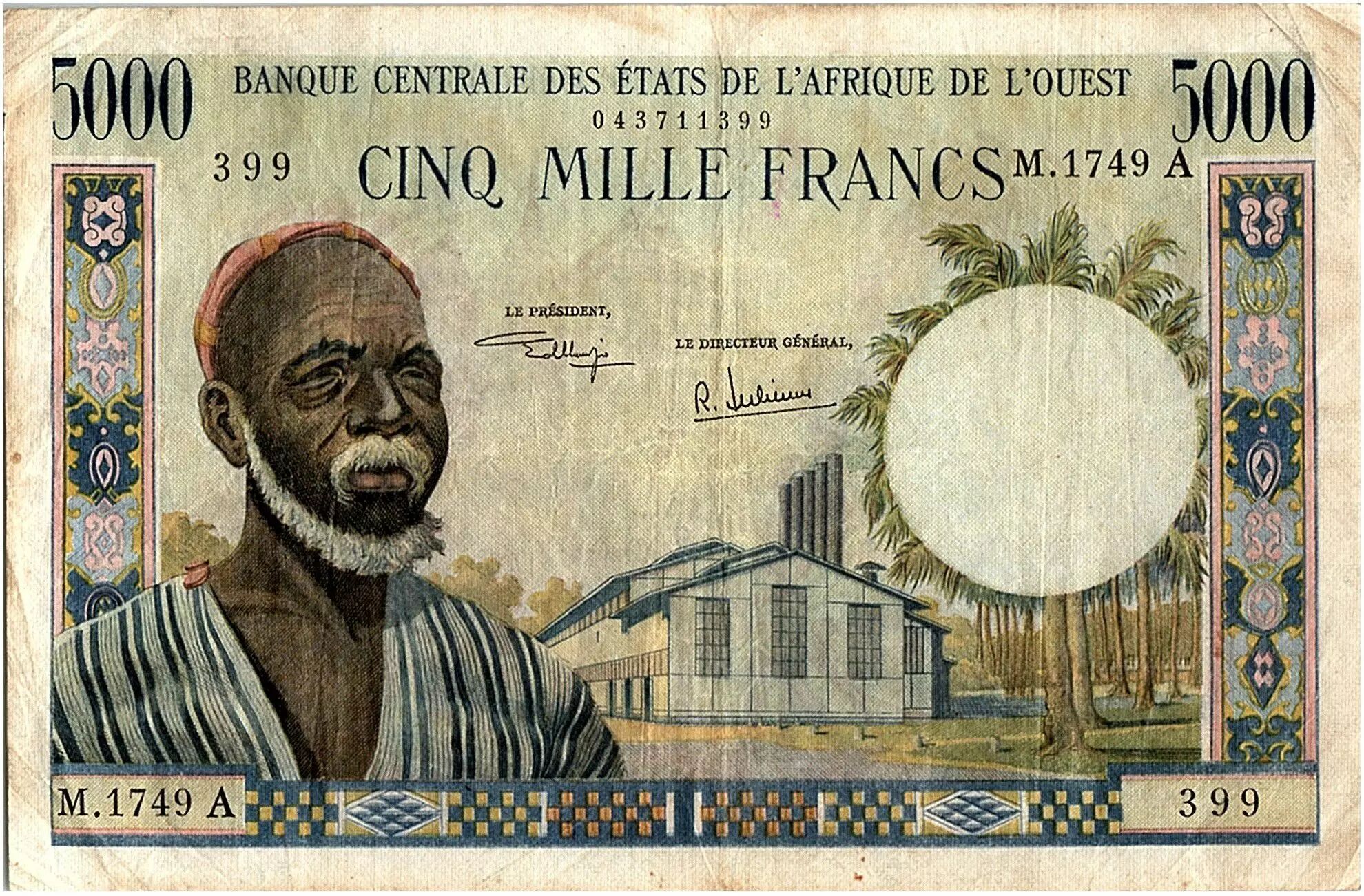 Home > > West AFrican States 5000 Francs, old man type 1961 ND - A Ivory Cost M.1749 A - P.104Ak - VF