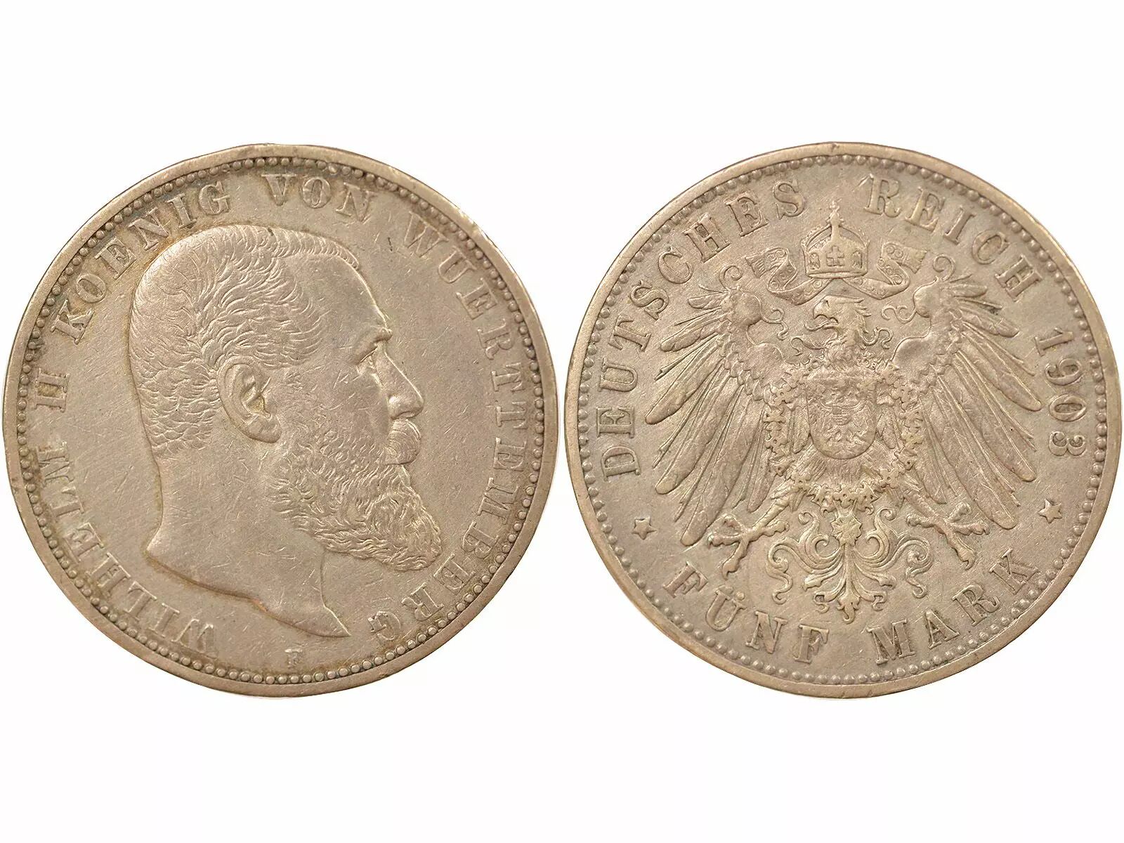 Coin Wurttemberg Wilhlem II - 5 Silver Mark - 1903 F Stuttgart