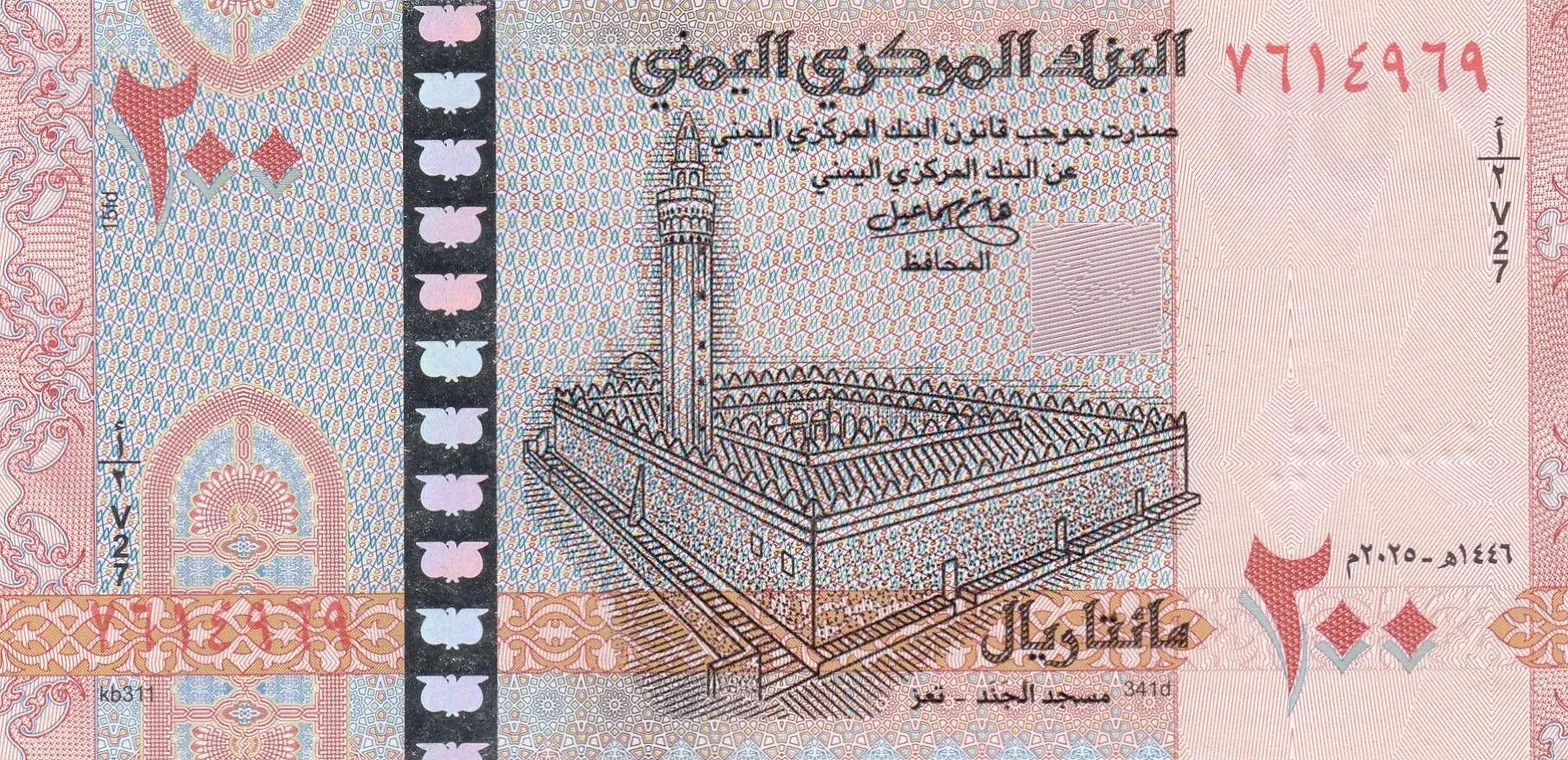 This banknote is issued by the Arab Republic of Yemen. It has a face value of 200 rials and dates from the year 2025.