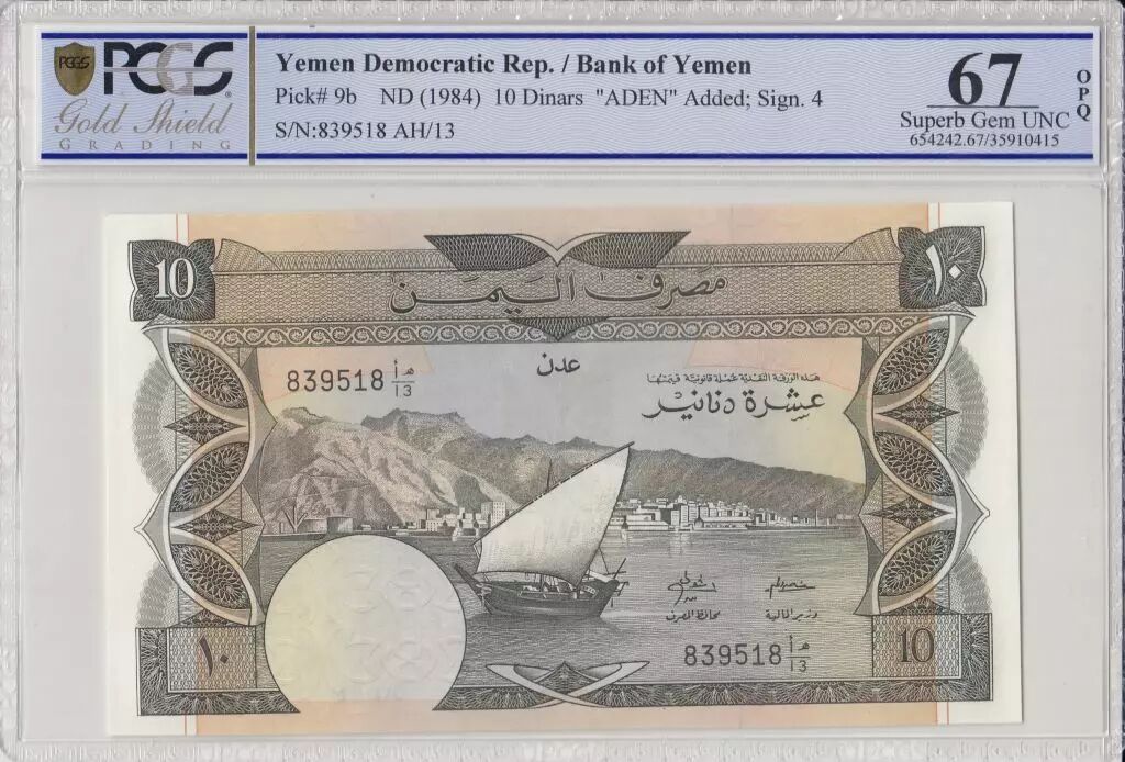 Billet Yémen (République Démocratique) 10 Dinars Bateau - Palmier - 1984 - PCGS 67 OPQ