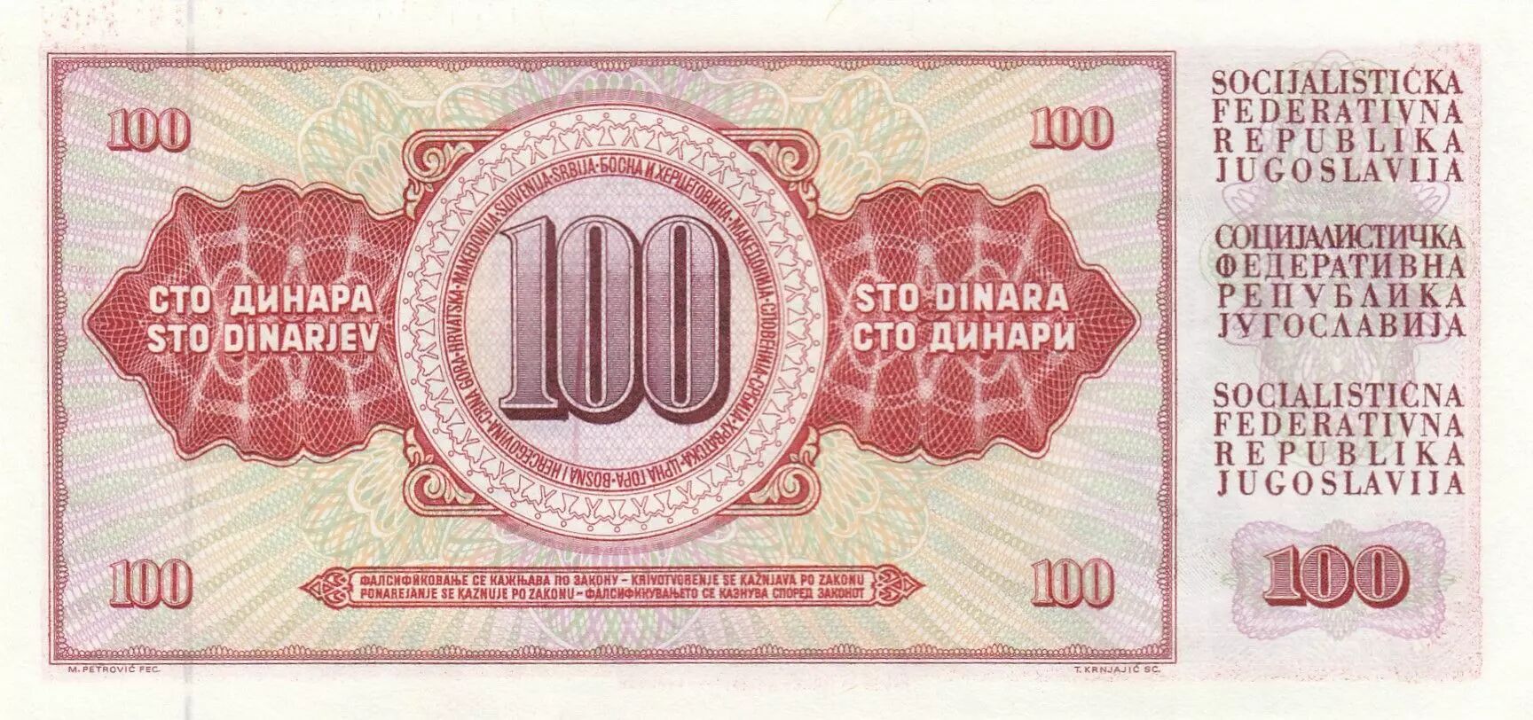 Le verso du billet, utilise les alphabets cyrillique et latin. L'inscription principale est "STO DINARJEV 100 STO DINARA". Une ligne énumère les différentes républiques constituant la Yougoslavie : . BOSNA I HERCEGOVINA . CRNA GORA . HRVATSKA . MAKEDONIJA . SLOVENIJA . SRBIJA ., entourant la désignation "SOCIALISTICNA FEDERATIVNA JUGOSLAVIJA". La valeur nominale "100" est répétée à plusieurs endroits. Les noms des artistes impliqués dans la conception du billet sont également mentionnés : M. PETROVIC FEC. (dessinateur) et T. KRNJAJIC (graveur).