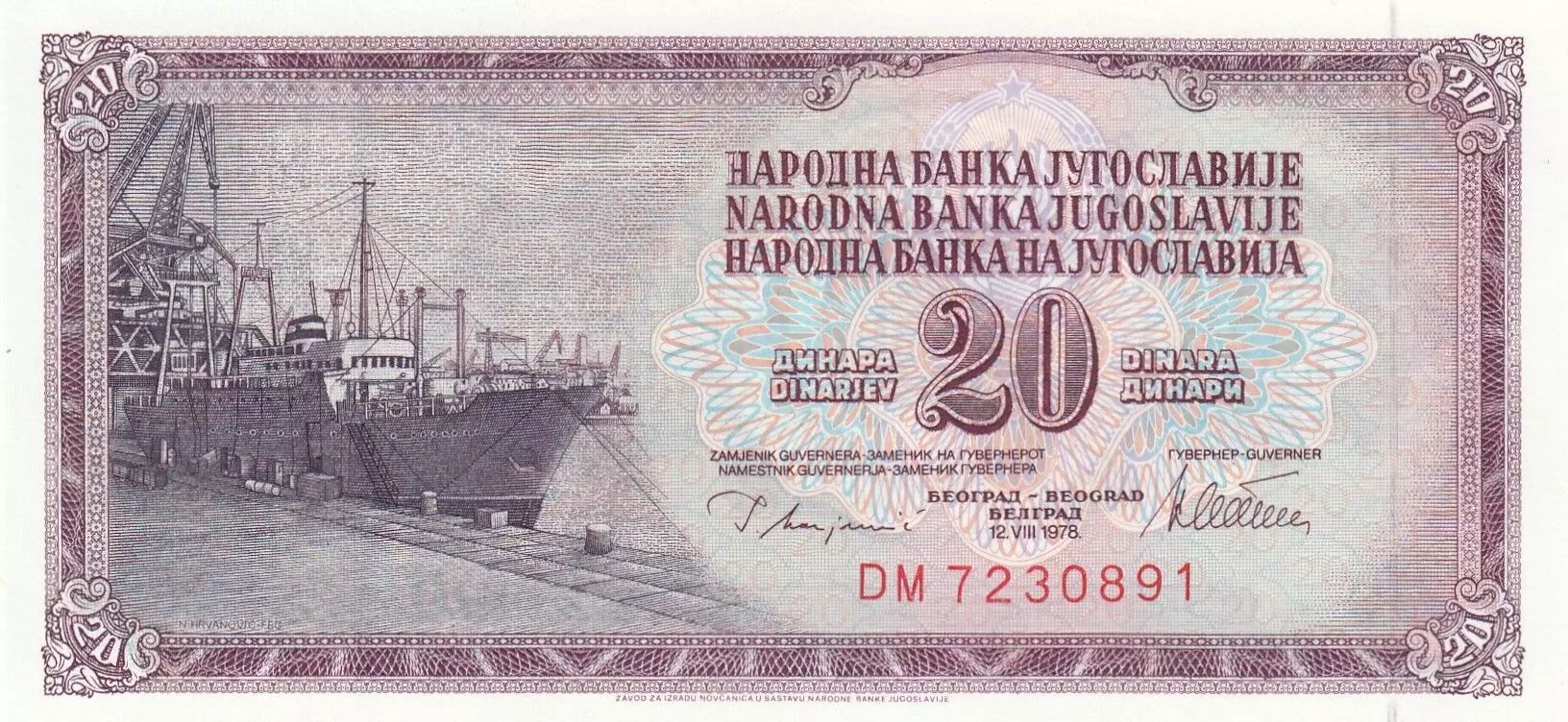 Le billet de 20 Dinara yougoslaves, émis en 1978, est une coupure commémorative de la République fédérative socialiste de Yougoslavie. Le recto du billet est dominant en violet, imprimé sur un fond multicolore complexe servant de dispositif de sécurité. L'élément central de la conception du recto est la représentation d'un navire à quai, positionné sur le côté gauche du billet. Les inscriptions comprennent la désignation de la banque émettrice, "NARODNA BANKA JUGOSLAVIJE", ainsi que la valeur nominale "20 DINARA" en serbe et "DINARJEV" en slovène. Un préfixe de deux lettres, suivi d'un numéro de série à sept chiffres, est également imprimé sur le recto.