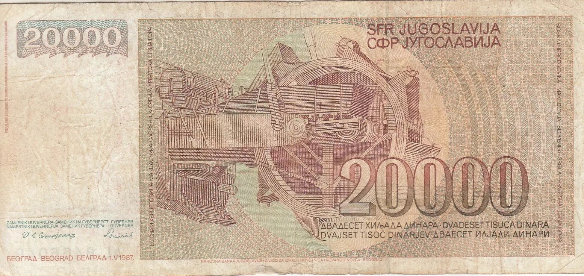 Ce billet de 20000 dinara de 1987 est un témoin de l'histoire économique et politique de la Yougoslavie à la fin des années 1980. Il reflète les symboles et les valeurs de cette période, ainsi que l'importance de secteurs comme l'industrie minière dans l'identité nationale.