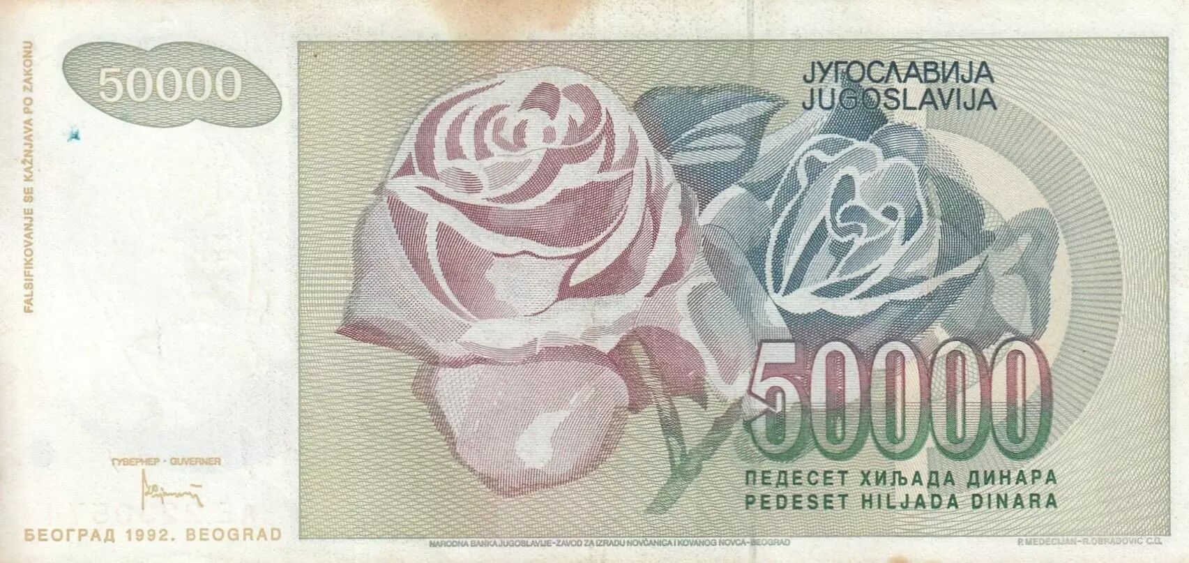 Ce billet de banque a été émis par la Yougoslavie en 1992. Il possède une valeur nominale de 50000 dinara. Le motif principal de ce billet est un enfant et une fleur.