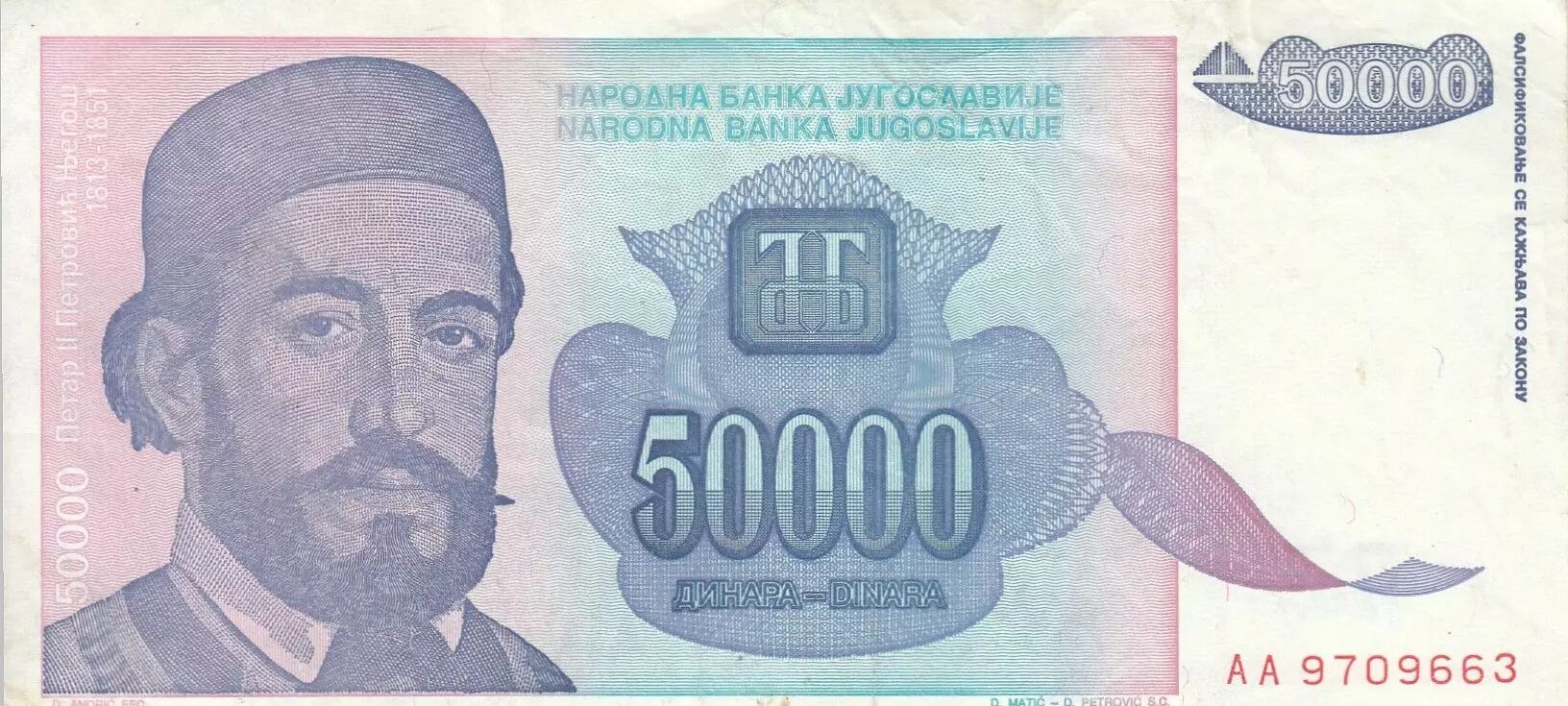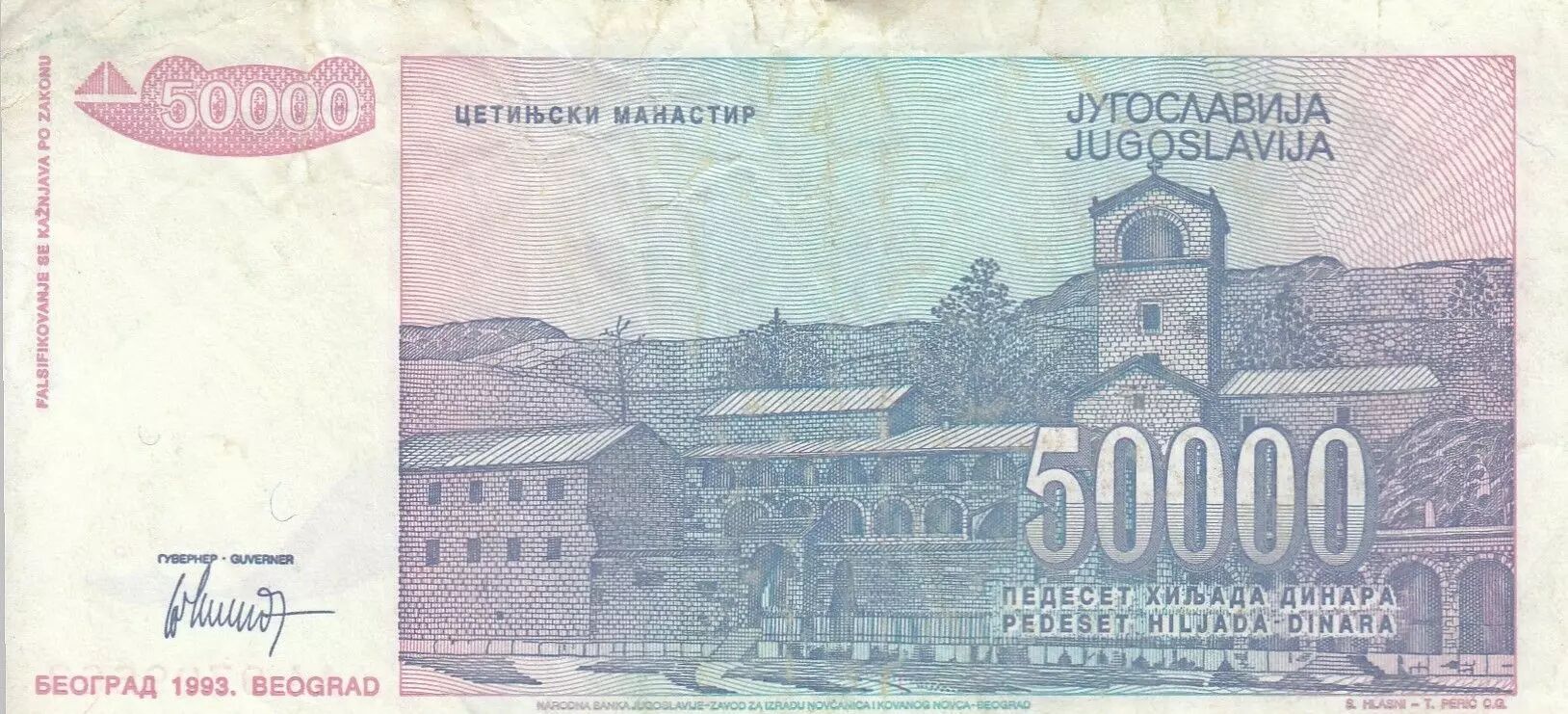 Le billet de 50000 dinara yougoslaves émis en 1993 représente une coupure de la période d'hyperinflation qu'a connue la Yougoslavie au début des années 1990. Ce billet fait partie d'une série émise durant cette période de turbulences économiques et politiques.