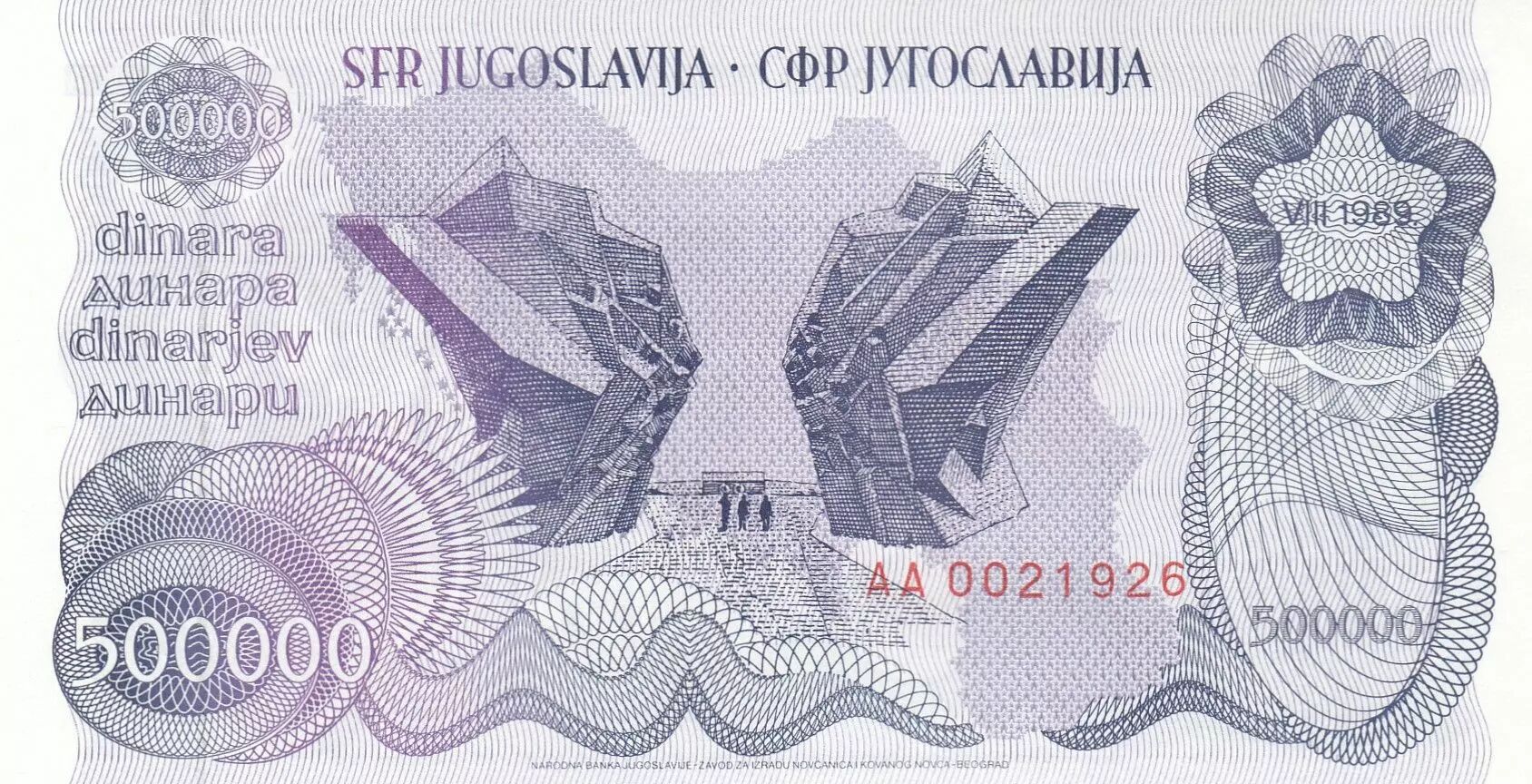 Accueil > Archivage > archivage-Billets du Monde > Yougoslavie 500000 dinara - Monument des partisans - 1990 - Série AA