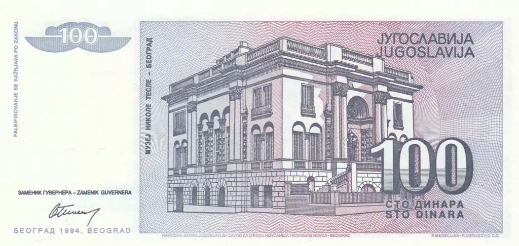 Home > World Banknotes > European Banknotes > Yugoslavia > Yugoslavia 100 Dinara 1994 - Nikola Tesla - Tesla Museum