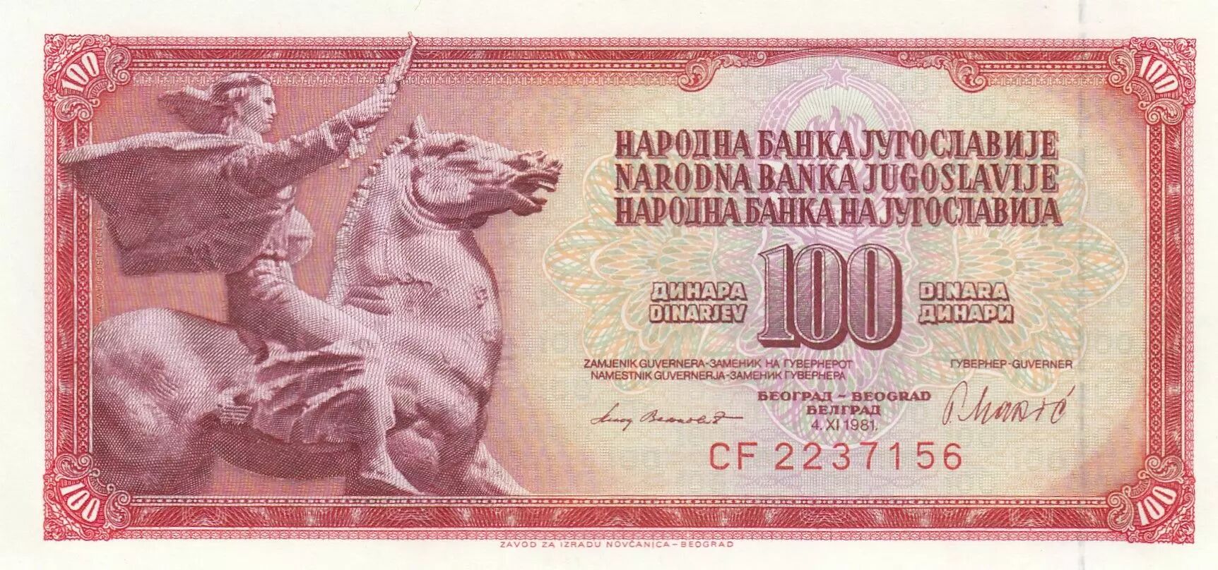The front of the banknote is mainly red, printed on a multicolored background. The central element of this face is a representation of Augustin?i?'s equestrian statue "Peace," located in the United Nations garden in New York. This statue is placed on the left side of the banknote. The inscriptions on the front include the name of the issuing bank in several languages: in Serbian, NARODNA BANKA JUGOSLAVIJE in Croatian and Macedonian. The face value is also indicated in numerals and letters: 100 DINARJEV DINARA. It also mentions the Zavod za Izradu Nov?anica, Beograd, the institute responsible for manufacturing banknotes.