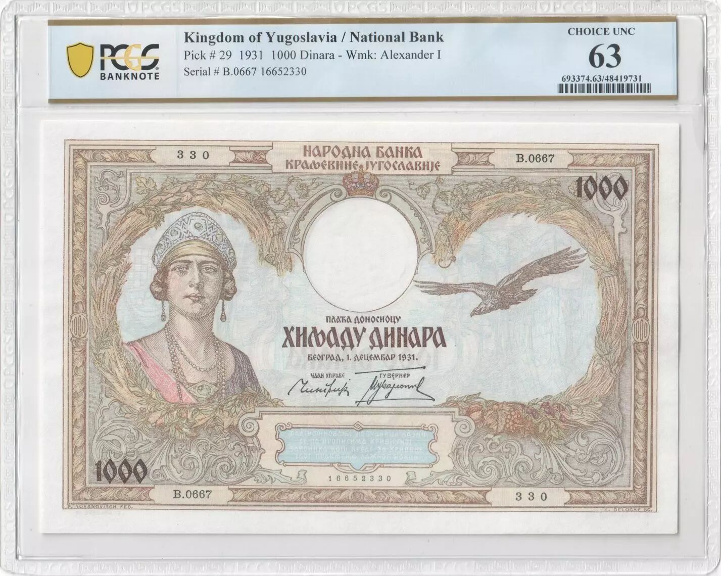 Banknote Yugoslavia 1000 Dinara 1931 - Queen Marie - PCGS 63