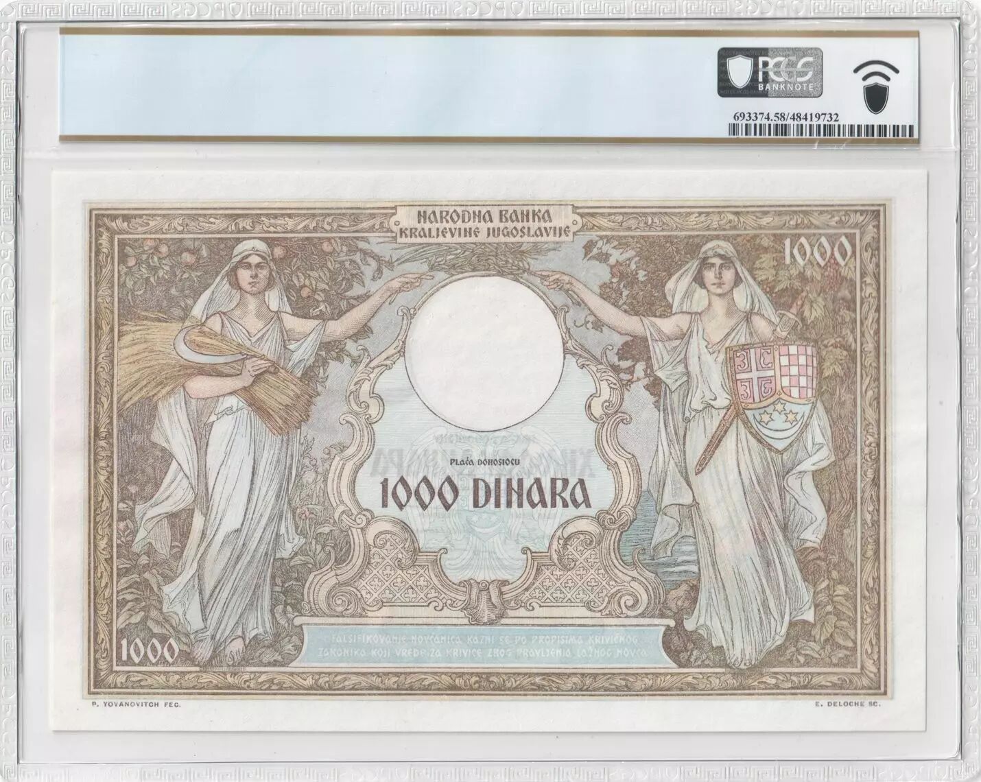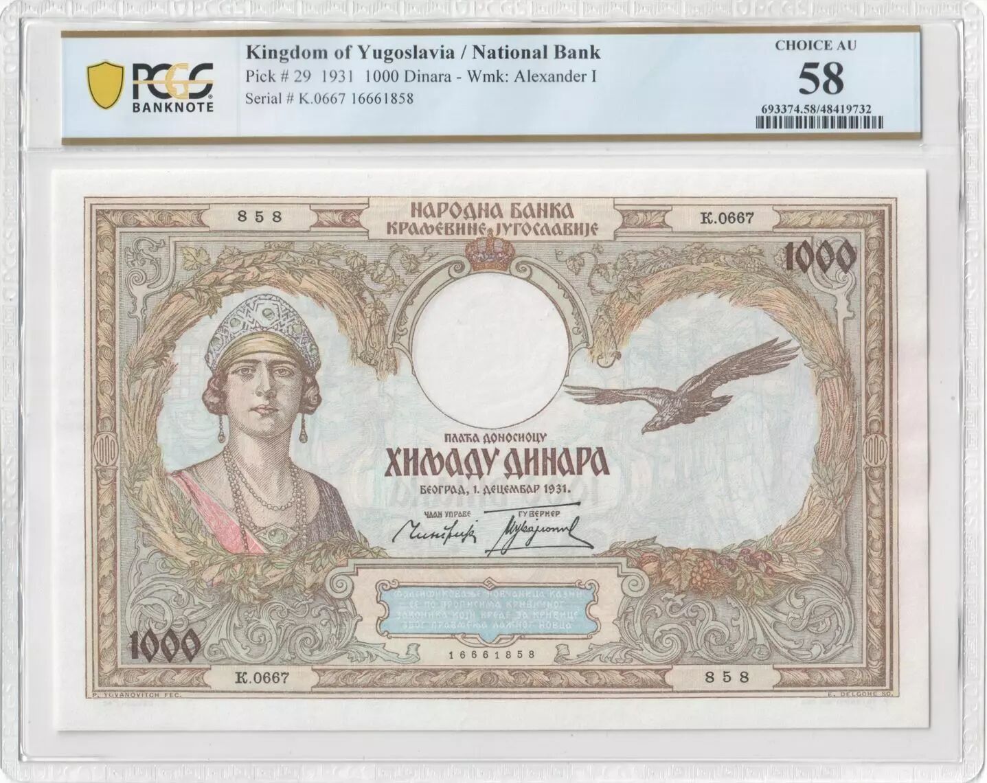 Home > World Banknotes > European Banknotes > Yugoslavia > Yugoslavia 1000 Dinara 1931 - Queen Marie - PCGS AU 58