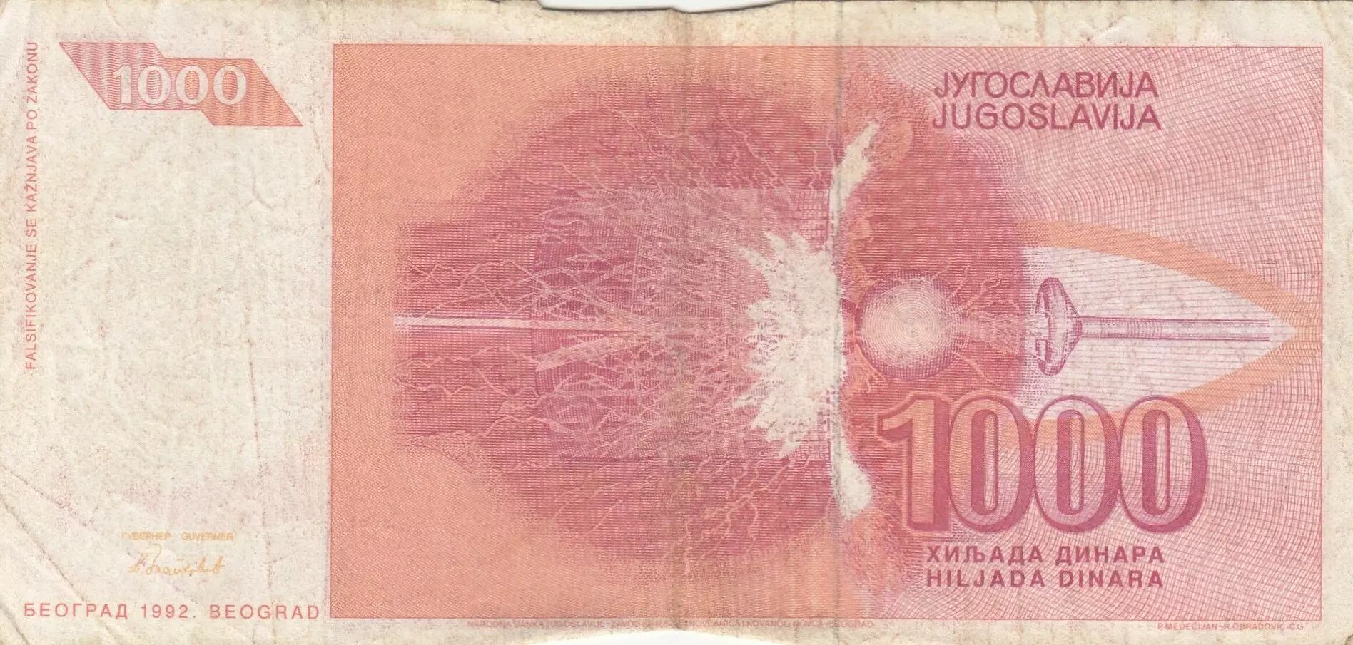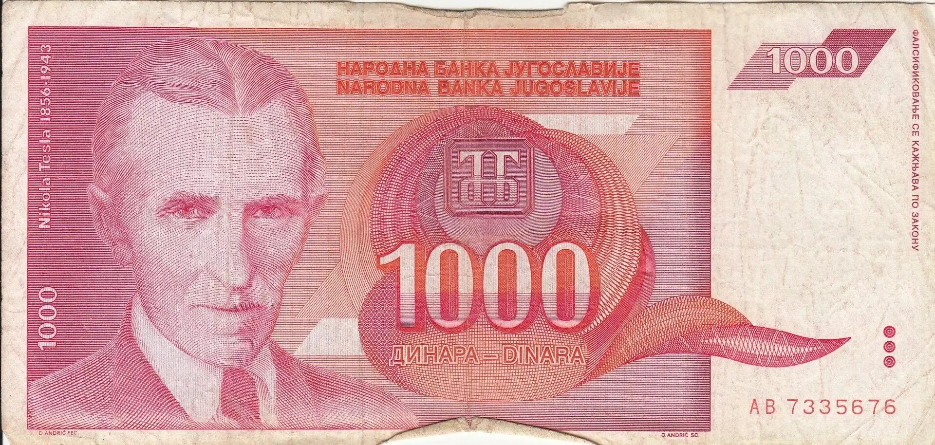 The 1000 Yugoslav dinara banknote, issued in 1992, features a design specific to that period of Yugoslavia's monetary history. On the obverse of the banknote is a portrait of Nikola Tesla, a scientist and inventor of Serbian origin. The portrait is executed with a precision that allows the characteristic features of Tesla to be distinguished. The face value of 1000 dinara is indicated in numerals and letters in various areas of the banknote.