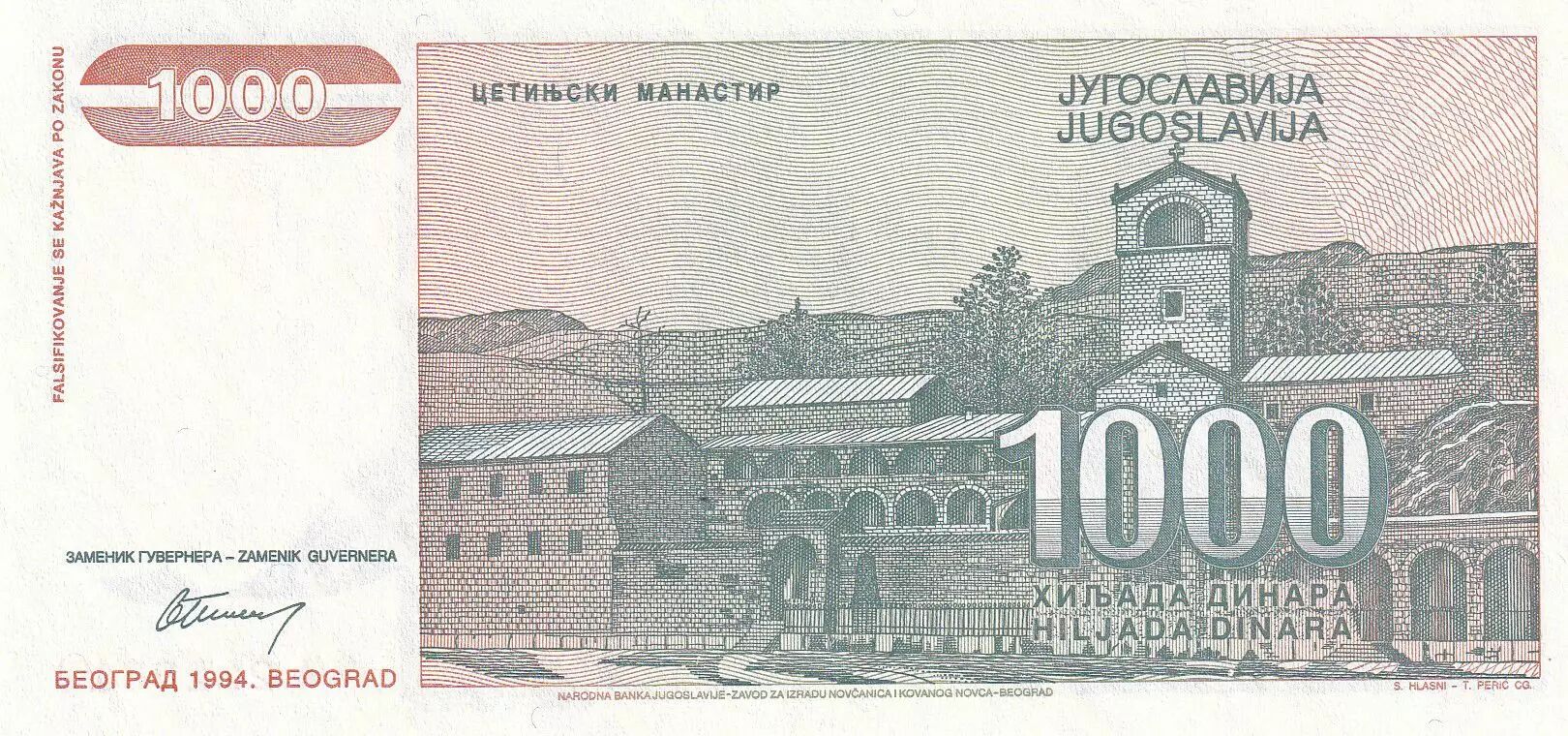 Banknote Yugoslavia 1000 Dinara - Petar II Petrovic Niegos - Monastery- 1994 - Serial AA - P.140