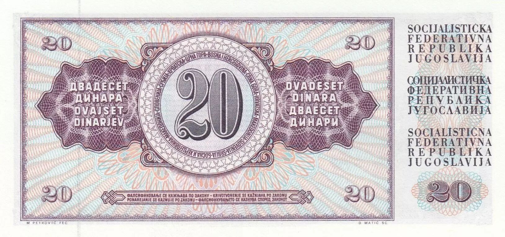 The back of the note features the face value "20" in large format, accompanied by the full denomination "DVADESET DINARA" in Serbian and "DVAJSET DINARJEV" in Slovenian. The inscription "SOCIJALISTICKA FEDERATIVNA REPUBLIKA JUGOSLAVIJA" identifies the issuing state. The initials "M. PETROVIC FEC D. MATIC SC" indicate the names of the artists involved in the design and engraving of the note, Miodrag Petrovi? and Du?an Mati? respectively.