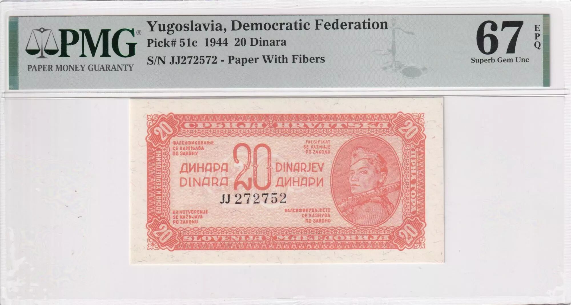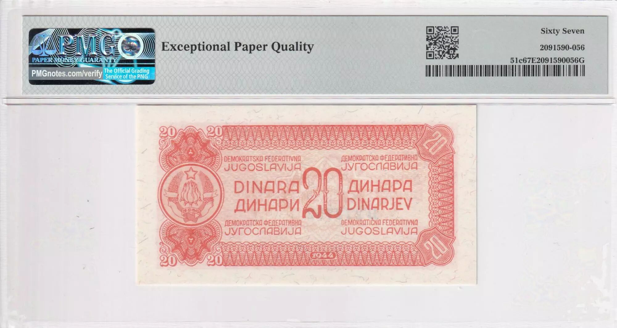 Home > > Yugoslavia 20 Dinara Soldier - 1944 - PMG 67 EPQ